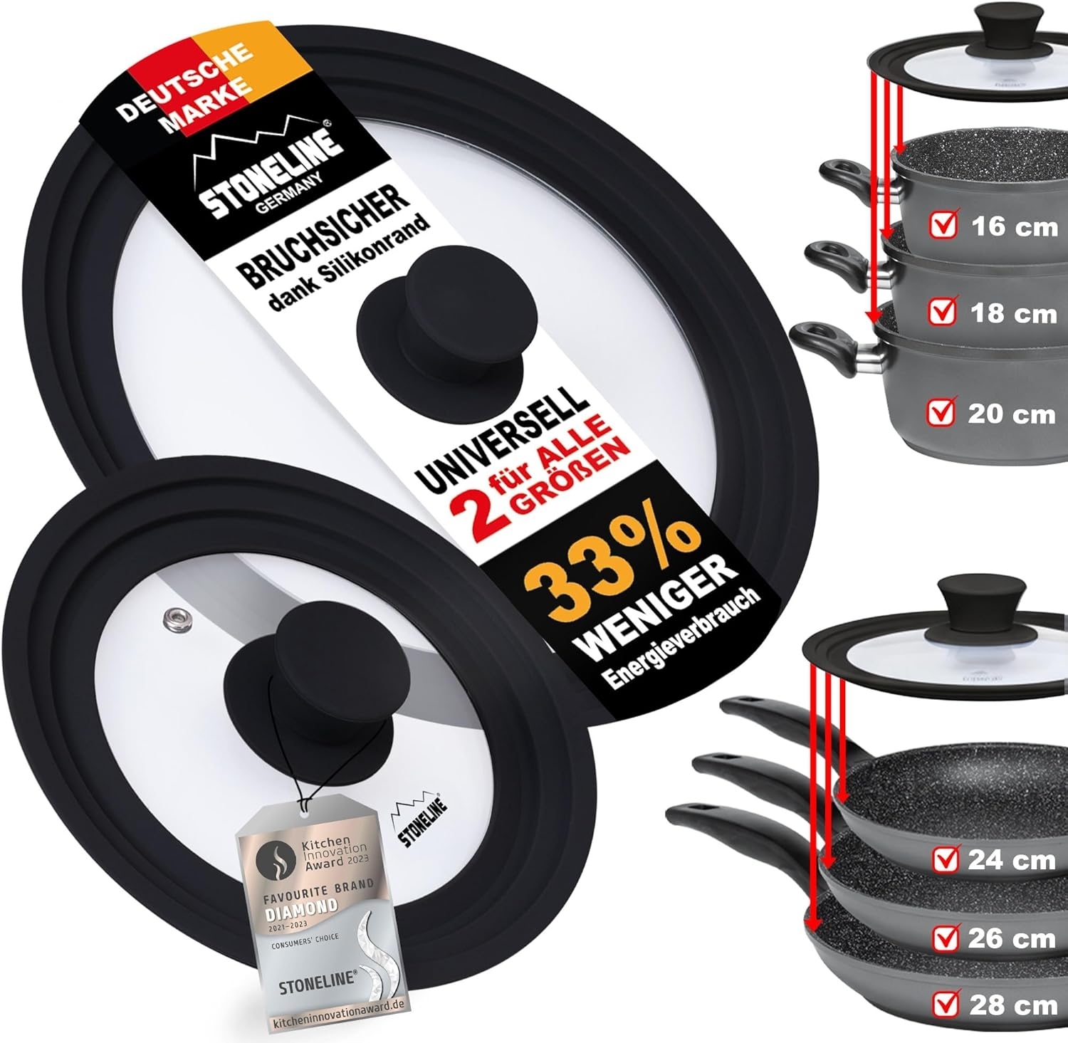 Die STONELINE Universaldeckel im 2-tlg. Set sind die ideale Lösung für Ihre Kochbedürfnisse. Mit Durchmessern von 16/18/20 cm und 24/26/28 cm passen sie auf verschiedene Pfannen und Töpfe. Der hochwertige Platinsilikonrand schützt Ihr Kochgeschirr, während das Sichtfenster aus bruchsicherem Glas eine einfache Überwachung des Kochvorgangs ermöglicht. Der Silikon-Knauf sorgt für einen sicheren Halt und verhindert Verbrennungen. Die Deckel sind spülmaschinen- und backofengeeignet bis 260 °C. **Highlights** - Universaldeckel für verschiedene Pfannen- und Topfgrößen - Bruchsicherer Glasdeckel mit Silikonrand - Sichtfenster zum Überwachen des Kochvorgangs - Silikon-Knauf für sicheren Halt - Backofengeeignet bis 260 °C **Produkteigenschaften** - 2-tlg. Set: - 1 Universaldeckel für Ø 16/18/20 cm - 1 Universaldeckel für Ø 24/26/28 cm - Farbe: Schwarz - Deckelrand aus hochwertigem Platinsilikon - Mit Dampfauslass - Spülmaschinengeeignet **Lieferumfang** - 1 Universaldeckel für Ø 16/18/20 cm - 1 Universaldeckel für Ø 24/26/28 cm - Ausschluss von weiteren Zubehörteilen