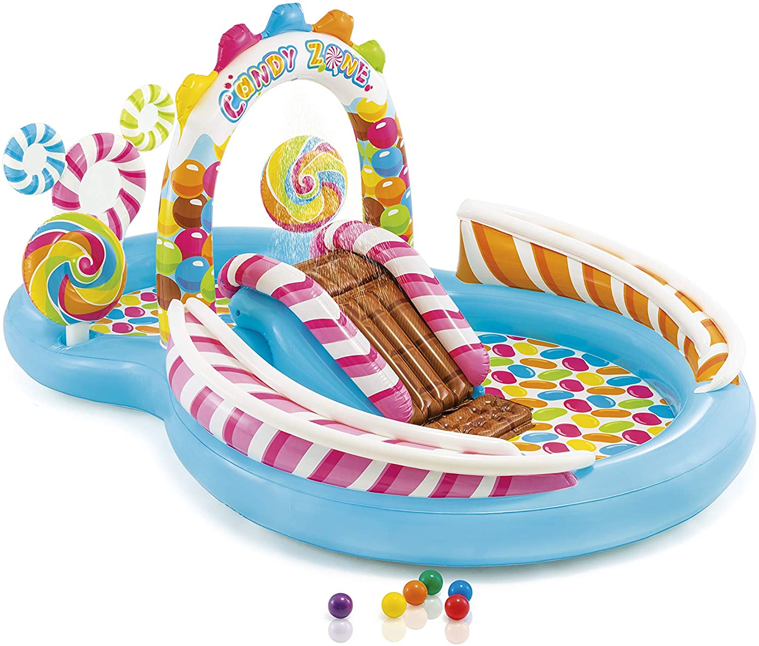 | Name | Intex ''Playcenter Candy Zone'' Planschbecken, 295 x 191 x 130 cm, ab 3 Jahren, inkl. Rutsche, 2 Bällebahnen, Sprühfunktion, aufblasbaren Lollipops und 6 Spielbällen |