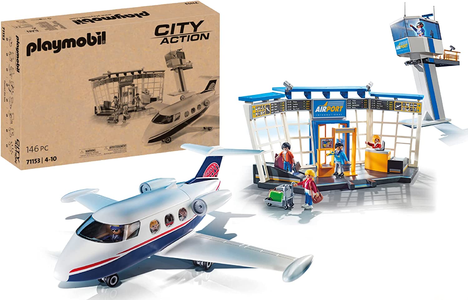 - Gute Reise: PLAYMOBIL Flughafen mit Tower inkl. Kontrollzentrum, Check-In und Personenkontrolle sowie PLAYMOBIL-Flieger mit Pilot, Passagieren uvm. - Spielzeug-Flugzeug mit um 360° drehbaren Rädern sowie abnehmbarem Dach, Spielzeug-Flughafen mit drehbaren Monitoren, dreh- und schwenkbaren Kameras uvm. - Wendbarer 2 in 1 Versandkarton (braun: außen) und PLAYMOBIL-Produktkarton (bunt: innen) zum Verschenken in einem - weniger Abfall, Schonung natürlicher Ressourcen durch Volumenreduzierung der Verpackung und 100% recycelter Verpackungsbeutel - Kinderspielzeug ab 4 Jahren, Täglich bespielbar: Anleitung zum Aufbau gemeinsam mit den Eltern, leichter Aufbau dank nummerierter Beutel, hochwertige Qualität und robustes Design, Reinigung der Teile (ohne Aufkleber) unter fließendem Wasser ohne chemische Mittel - Lieferumfang: 1x PLAYMOBIL City Action Flughafen mit Flugzeug \[Exklusiv bei Amazon\], 146-teiliges Spielfiguren-Set mit Anleitung zum Aufbau: 1 PLAYMOBIL-Flugzeug, 1 Tower, 1 Gebäude, 1 PLAYMOBIL-Pilot, 1 PLAYMOBIL-Stewardess, 6 Personen, 135 Zubehörteile, Material: Kunststoff, in nachhaltiger E-Commerce Verpackung (Wendekarton), Lx Tx H Flugzeug: ca. 41 x 44 x 15 cm, Flughafen: ca. 46,5 x 23 x 18,5 cm (ohne Kameras), Tower: ca. 24 x 15 x 16 cm (ohne Antenne), Gewicht: 1659 g, 71153, Hersteller: Playmobil