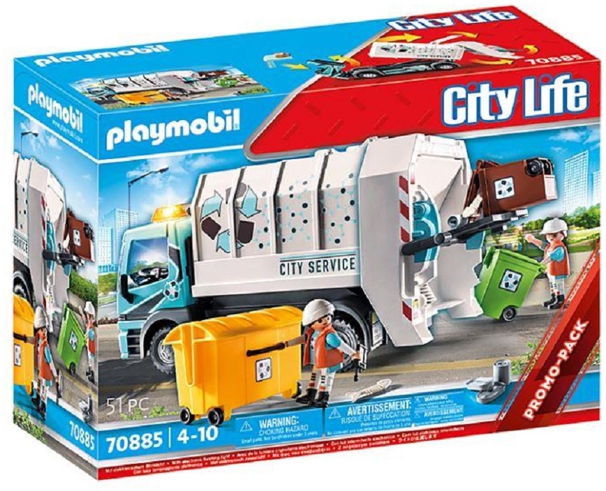- Das PLAYMOBIL City Life 70885 'Müllfahrzeug mit Blinklicht' besteht aus 51 Teilen und ist für Kinder ab 4 Jahren geeignet.
