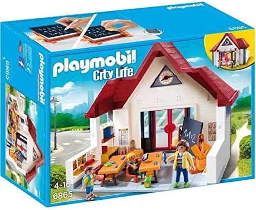 | Ausstattung | Figuren: 1 Lehrerin, 1 Junge, 1 Mädchen | Tiere: keine | Zubehör: 1 Schulgebäude, 1 Schultafel, 2 Tische, 4 Stühle, 1 Trommel, 2 Trommelstöcke,1 Gitarre, 1 Xylophon, 1 Rassel, 1 Tafelstift, 1 Schwamm, 3 Ordner, 6 Stifte, 1 Pack Bücher, 2 Bücher, 1 Reagenzglasständer, 3 Reagenzgläser, 2 Rucksäcke, 1 Behälter für 1 Geodreieck und 1 Lineal, 1 Schwammablage |