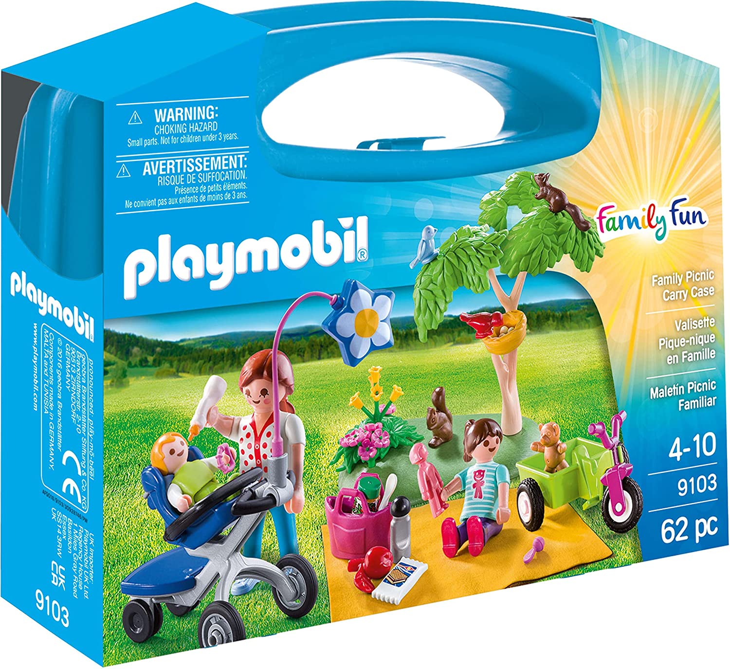 Playmobil 9103 Family Fun - großes Picknick in der Tragetasche: Familien-Picknick-Tragetasche. Das einzigartige Spielprinzip regt die Fantasie und Kreativität an und fördert so die Entwicklung der Kinder: Mit PLAYMOBIL können Kinder nicht nur in viele verschiedene Rollen schlüpfen, sondern auch die Welt in der Miniatur nachbilden und erleben. Mit mehreren Talenten überwinden diese fröhlichen Figuren erfolgreich alle möglichen Herausforderungen – als Ritter oder Piraten in historischen Szenarien, als Bauarbeiter, Tierärzte und Polizisten heute, oder als Geheimagenten in virtuellen Welten. Die kreativen Menschen von Playmobil erwarten ständig neue Ideen und Ergänzungen, um Kindern überall lang anhaltenden Spaß zu bringen. Material: Kunststoff Geschlecht: Mädchen und Jungen. Für dieses Produkt gibt es folgende Sicherheitshinweise Achtung: Nicht für Kinder unter 36 Monaten geeignet Achtung: Benutzung unter unmittelbarer Aufsicht von Erwachsenen Achtung: Enthält Spielzeug. Beaufsichtigung durch Erwachsene empfohlen. Komplett mit einem Dreirad, Kinderwagen und viel Zubehör Inklusive Picknick-Tasche. Zum Spielen, Aufbewahren und Transportieren. Enthält 3 Play Mobil-Figuren. Fördert das Lernen durch interaktives Spielen.