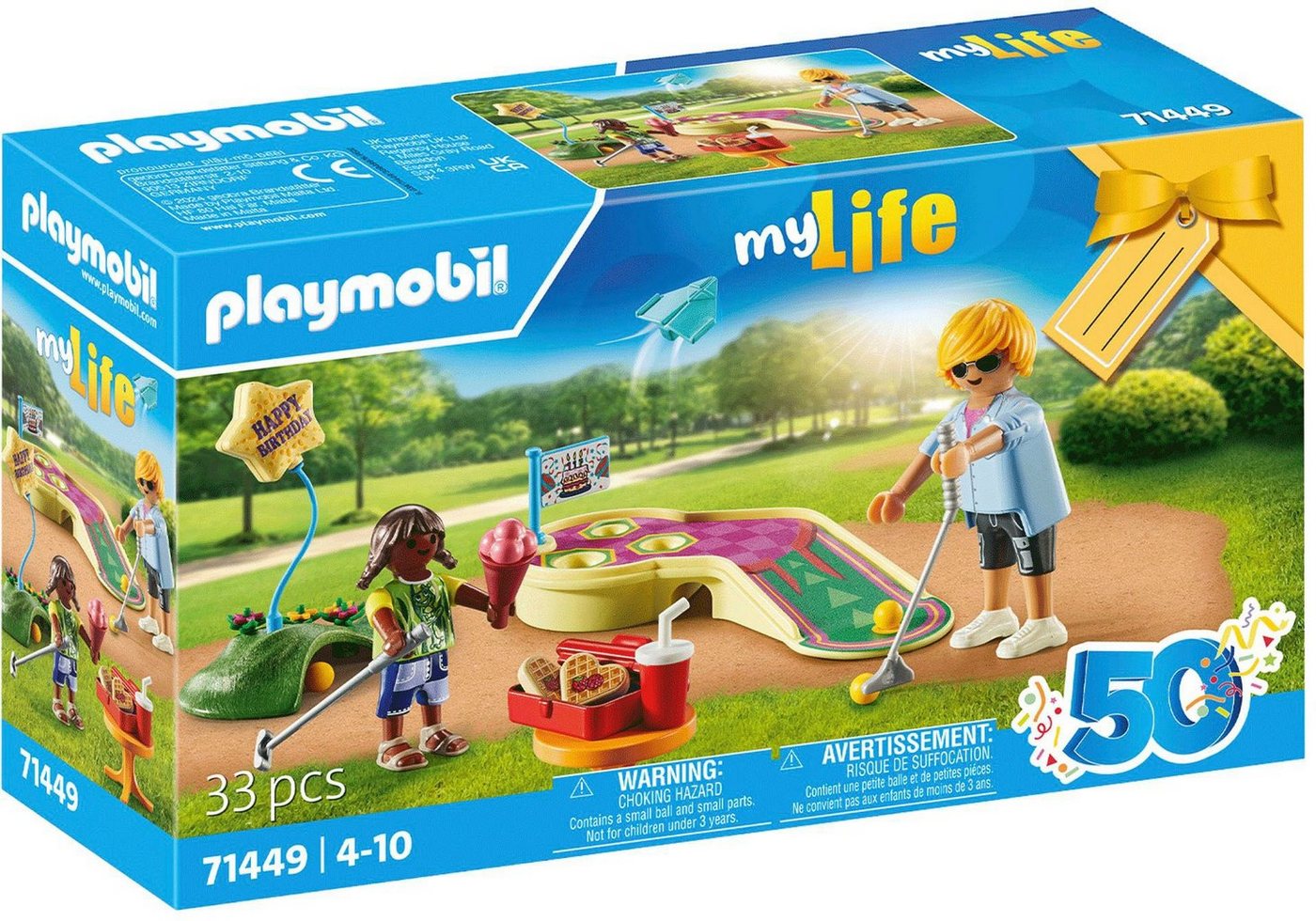 - Stundenlangen Spielspaß für Minigolffans gibt es mit dem tollen PLAYMOBIL-Geschenkset Minigolf. Dank der dekorativen Verpackung, die mit dem Namen des Geburtstagskindes beschriftet werden kann, spart man Gechenkpapier. Die Minigolfbahn hat einiges zu bieten: Der vordere Bereich ermöglicht das perfekte Platzieren des Balls für den Abschlag, während auf der oberen Ebene drei weitere Mulden als Ziellöcher warten. Der Durchgang unterhalb der Bahn kann als Tunnel genutzt werden, und der Hügel dient als zusätzliches Ziel. In der zweiteiligen Dose können die süßen Waffelherzen verstaut werden, während die Golfschläger, der Papierflieger, die Eistüte, der Getränkebecher und die Luftballonschnur praktische Griffe haben und von den Figuren in der Hand gehalten werden können.