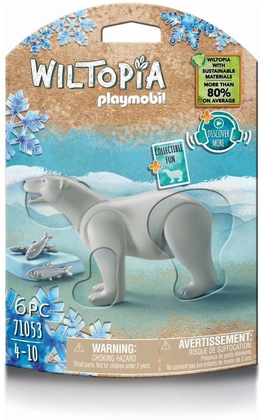 WILTOPIA ist die erste umweltfreundliche Produktlinie von PLAYMOBIL, die im Schnitt aus über 80 % nachhaltigem Material besteht. Das Set enthält einen PLAYMOBIL Eisbär inklusive Zubehör, Tierwissenskarte zum Sammeln und spannendem Audio-Content. Mit WILTOPIA können Kinder Tiere und Natur in ihrem eigenen Kosmos entdecken und in fantasievolle Rollenspiele eintauchen. Eisbären, auch Polarbären genannt, gehören zur Familie der Bären. Sie bewohnen die nördlichen Polarregionen und sind eng mit dem Braunbären verwandt. Neben Kamtschatkabären und Kodiakbären gelten Eisbären als die größten an Land lebenden Raubtiere der Erde. Erwachsene männliche Eisbären erreichen eine Kopf-Rumpf-Länge von 2 bis 2,50 Metern - in etwa so hoch wie eine Etage eines Wohnhauses. Ihr gelblich-weißes Fell dient den Eisbären sowohl zur Tarnung als auch als Wärmedämmung. Die Wiltopia-Spielwelt von PLAYMOBIL lädt Kinder dazu ein, spannende und schützenswerte Regionen unserer Welt und ihre zahlreichen tierischen Bewohner zu entdecken und verbindet Spielen und Lernen auf einzigartige Weise. Das PLAYMOBIL-Set enthält eine Eisbärenfigur, eine Schneedecke, Fische und eine Tierwissenskarte. Die Figur kann ihr Unterkiefer aufklappen, den Kopf neigen sowie alle vier Beine einzeln bewegen.