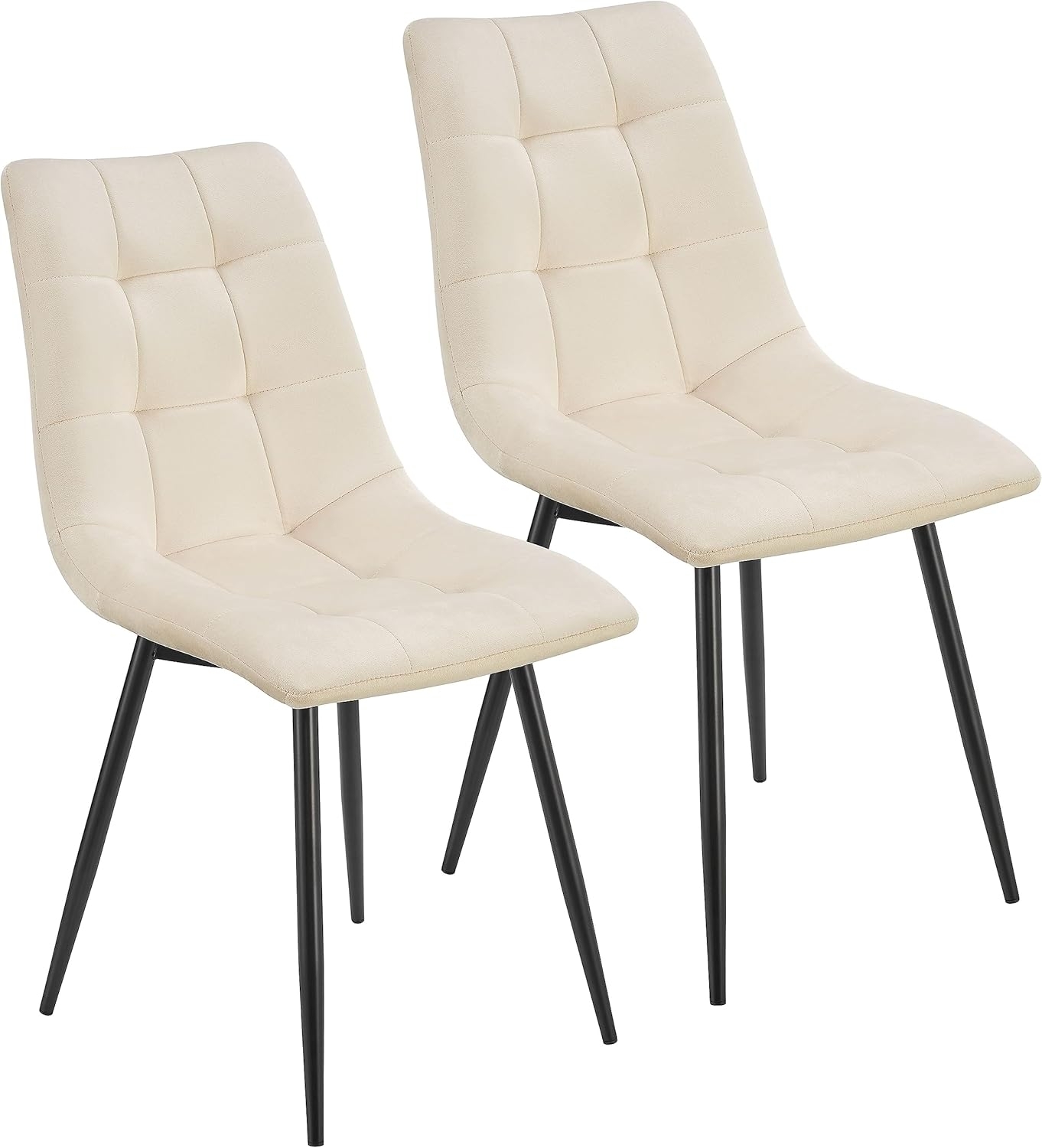 Der moderne Esszimmerstuhl Blanca im 2er Set vereint stilvolles Design und hohen Komfort. Der edle Samtbezug in Beige und die schwarzen Stahlbeine verleihen den Stühlen eine elegante Note. Mit ihrem Chesterfield Design sind sie ein echter Blickfang in jedem Raum. Die Stühle sind weich gepolstert und bieten einen hohen Sitzkomfort. Jedes Modell ist bis zu 120 kg belastbar und die kratzfesten Beine sorgen für Langlebigkeit. **Highlights** - 2 moderne Stühle für Esszimmer, Küche & Büro - Elegantes Design mit Samtbezug & grazilen Beinen - Gepolstert, samtig weich & bequeme Sitzform für hohen Komfort - Sicherer Stand durch Beine aus Stahl - bis 120 kg belastbar - Kratzfeste Stuhlbeine durch Pulverbeschichtung **Produkteigenschaften** - Farbe Bezug: Beige - Farbe Gestell: Schwarz - Einsatzbereich: Indoor - Max. Belastbarkeit: 120 kg - Material Bezug: Samt - Material Gestell: Stahl, pulverbeschichtet - Maße Stuhl (BxLxH): 46 x 61 x 90 cm - Sitzhöhe: 49 cm - Höhe Rückenlehne: 40 cm - Durchmesser Beine: 3 cm **Lieferumfang** - 2 x Samtstuhl - 1 x Montagematerial - 1 x Anleitung