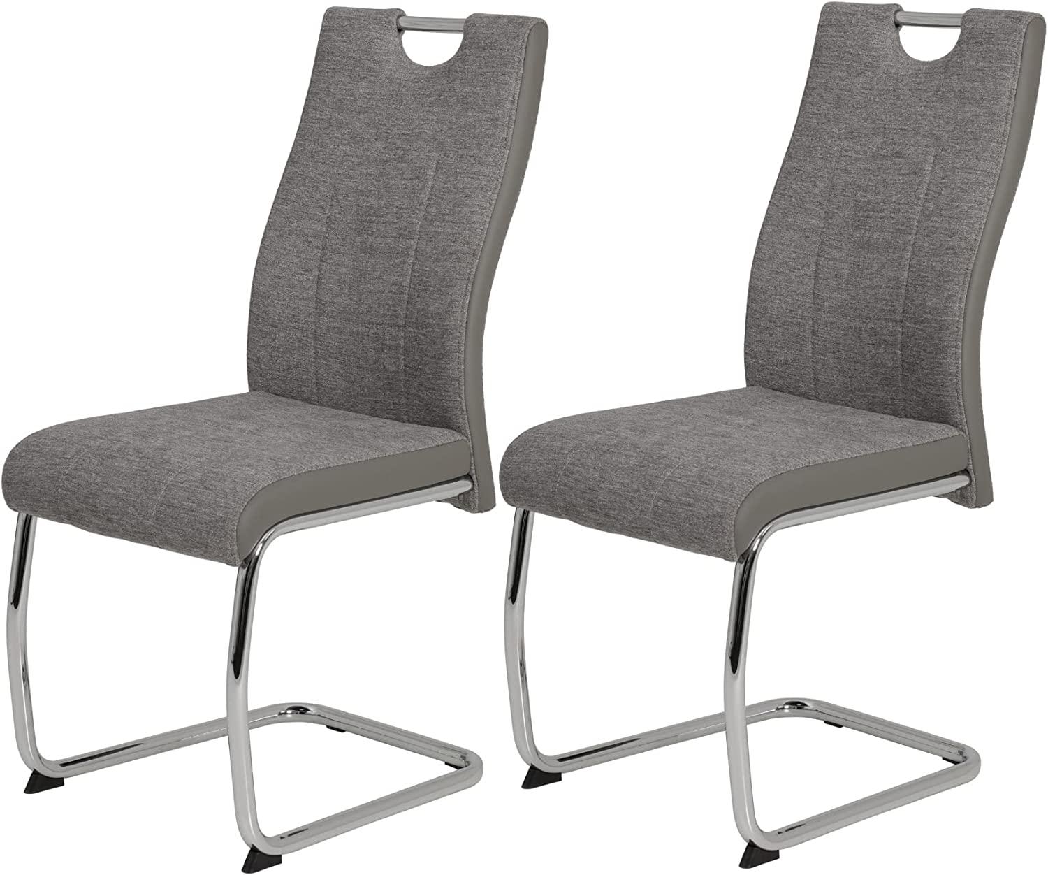 Modern und elegant präsentiert sich das 2er Set Schwingstuhl Alina in Webstoff Grau. Ergonomisch geformt, bietet er optimalen Sitzkomfort und überzeugt durch attraktive Steppnähte sowie eine seitliche Kunstlederabsetzung. Das verchromte Metallgestell und das praktische Griffloch im Rücken runden das Design ab. Mit einer maximalen Belastbarkeit von 120 kg ist dieser Stuhl die ideale Ergänzung für Ihr Zuhause. **Highlights** - Ergonomisch geformt für perfekten Sitzkomfort - Attraktive Steppnähte und Kunstlederabsetzung - Griffloch im Rücken für einfache Handhabung - Verchromtes Metallgestell für modernen Look **Produkteigenschaften** - Bezug: Webstoff Grau (100% Polyester) und Kunstleder Grau (97% Polyurethan, 3% Baumwolle) - Max. Belastbarkeit: 120 kg - Maße: H 98 cm, B 43 cm, T 59 cm, SH 48 cm, ST 44 cm **Lieferumfang** - 1x 2er Set Schwingstuhl Alina - Webstoff Grau (zerlegt) - Aufbauanleitung für einfache Montage