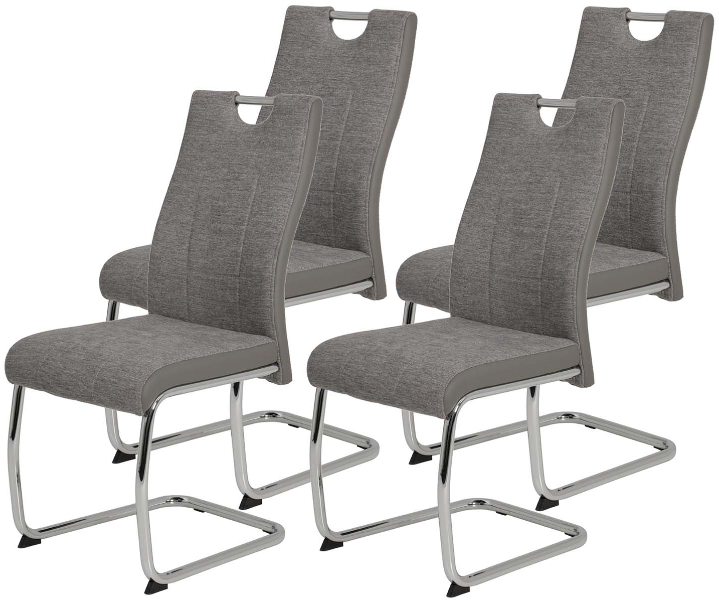 Das 4er Set Schwingstuhl Alina in Grau vereint modernes Design mit hohem Sitzkomfort. Ergonomisch geformt und ausgestattet mit einem attraktiven Webstoff sowie seitlichen Kunstlederabsetzungen, bietet dieser Stuhl eine stilvolle Ergänzung für Ihr Zuhause. Das verchromte Metallgestell sorgt für Stabilität und Langlebigkeit. Mit einem Griffloch im Rücken für einfaches Handling ist der Alina Schwingstuhl sowohl funktional als auch ästhetisch ansprechend. **Highlights** - Ergonomisch geformt für perfekten Sitzkomfort - Attraktiver Webstoff mit Steppnähten - Seitliche Absetzung in Kunstleder - Griffloch im Rücken für praktische Handhabung - Verchromtes Metallgestell für bleibenden Eindruck **Produkteigenschaften** - Metallgestell Rundrohr, verchromt - Bezug Webstoff Grau (100% Polyester) und Kunstleder Grau (97% Polyurethan, 3% Baumwolle) - Max. Belastbarkeit: 120 kg - Maße: H98 x B43 x T59 cm, Sitzhöhe 48 cm, Sitztiefe 44 cm **Lieferumfang** - 1x 4er Set Schwingstuhl Alina - Webstoff Grau - Zerlegt geliefert, mit leicht verständlicher Aufbauanleitung - Dekoration und Zubehör nicht enthalten