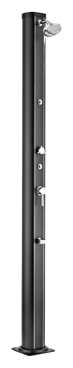 - Die Solardusche besteht aus robustem Aluminium und hat eine elegante schwarze Farbe.
