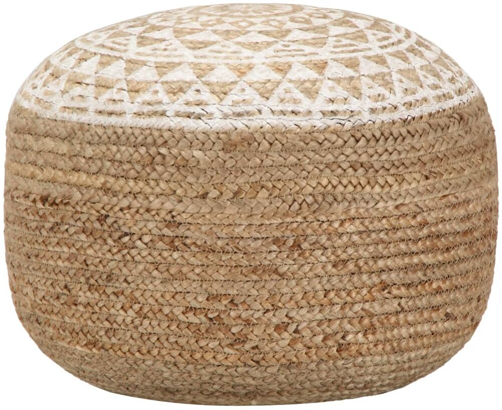 Ein handgefertigter Sitzpuff in Weiß aus Jute, mit einem Durchmesser von 45 cm und einer Höhe von 30 cm. Die EPS-Perlenfüllung sorgt für optimalen Komfort und macht den Pouf zu einer stilvollen Ergänzung für Ihr Zuhause. Ideal zum Sitzen oder als Fußablage, schafft er eine gemütliche Atmosphäre in jedem Raum. Die geflochtenen Jutesaiten verleihen dem Sitzpuff einen einzigartigen Look. **Highlights** - Handgefertigt aus geflochtenen Jutesaiten - Mit EPS-Perlen gefüllt für optimalen Komfort - Stilvolle und dekorative Ergänzung für Ihr Zuhause - Perfekt zum Sitzen oder als Fußablage - Schafft ein gemütliches Ambiente in jedem Zimmer **Produkteigenschaften** - Farbe: Weiß mit gedrucktem Muster - Material: Jute mit EPS-Perlen Füllung - Abmessungen: 45 x 30 cm (Durchmesser x Höhe)