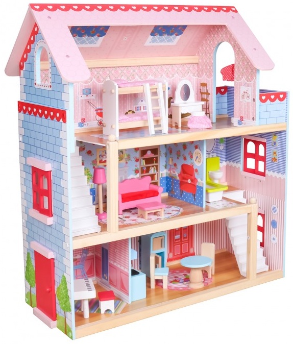 Steigern Sie die Kreativität und Fantasie Ihres Kindes Unser Puppenhaus aus Holz ist eines der schönesten Geschenke, die man einem Kind machen kann. Mit diesem zeitlosen Geschenk können Ihre Kinder stundenlang in ihre besondere Welt der Phantasie eintauchen. Die Kinder haben die Möglichkeit, Möbel neu zu ordnen und lebensechte Szenarien im Kopf zu kreieren und so die kognitive und soziale Entwicklung zu fördern. Dieses farbenfrohe Spielzeug eignet sich ebenso gleich für ein Kind, als auch für mehrere Spielkameraden und ist ideal für die Verwendung zu Hause, im Spielzimmer, in der Schule oder im Kindergarten. - Dreistöckiges 5-Zimmer-Puppenhaus aus Holz mit Balkon - Inklusive Möbel - Gesamtmaße: 60,5 x 71 x 32,5 cm - Geeignet für Kinder ab 3 Jahre - Ideal für zu Hause, im Spielzimmer, in der Schule oder im Kindergarten - Ein Kind kann alleine oder mit den Freunden spielen - Geeignet für 13 cm große Puppen - Fantasievolles Spielen leistet einen gesunden Beitrag zur allgemeinen Entwicklung des Kindes **Technische Informationen:** - Gesamtmaße: 60,5 x 71 x 32,5 cm - Möbel und Zubehör enthalten (16 Stück): - Küche und Esszimmer: Kühlschrank, Herd, Esstisch und zwei Stühle - Eingangshalle: Klavier und ein Stuhl - Badezimmer: Badewanne und Toilette - Wohnzimmer: Sofa, Couchtisch, Lampe - Schlafzimmer: Etagenbett und Frisiertisch - Balkon: Sonnenschirm - Verschiedene Aufkleber - Möbelmaterial: MDF und Kiefernholz - Puppenhaus: Massivholz, MDF, Kunststoff, Stoff **Lieferumfang:** - 1 x Puppenhaus PPHS01 als Bausatz zur Selbstmontage - 1 x Bedienungsanleitung in (EN / FR / DE / ES / IT) Die Lieferung unserer Produkte auf Inseln ist nicht möglich. **Sicherheitshinweis:** ACHTUNG! Nicht für Kinder unter 36 Monaten geeignet. ACHTUNG! Nur für den Hausgebrauch.