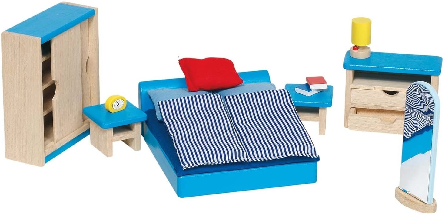 - Das Goki Miniatur-Schlafzimmer-Set besteht aus 14 Teilen, darunter ein Bett, Kleiderschrank, Nachttische, Kommode, Wecker, Spiegel, Kissen, Nachttischlampe und Bücher