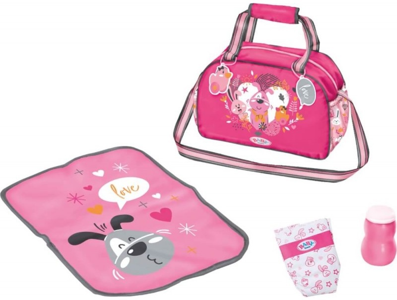 - Die BABY born Wickeltasche enthält eine Wickelunterlage, eine Windel und eine Puderdose.
