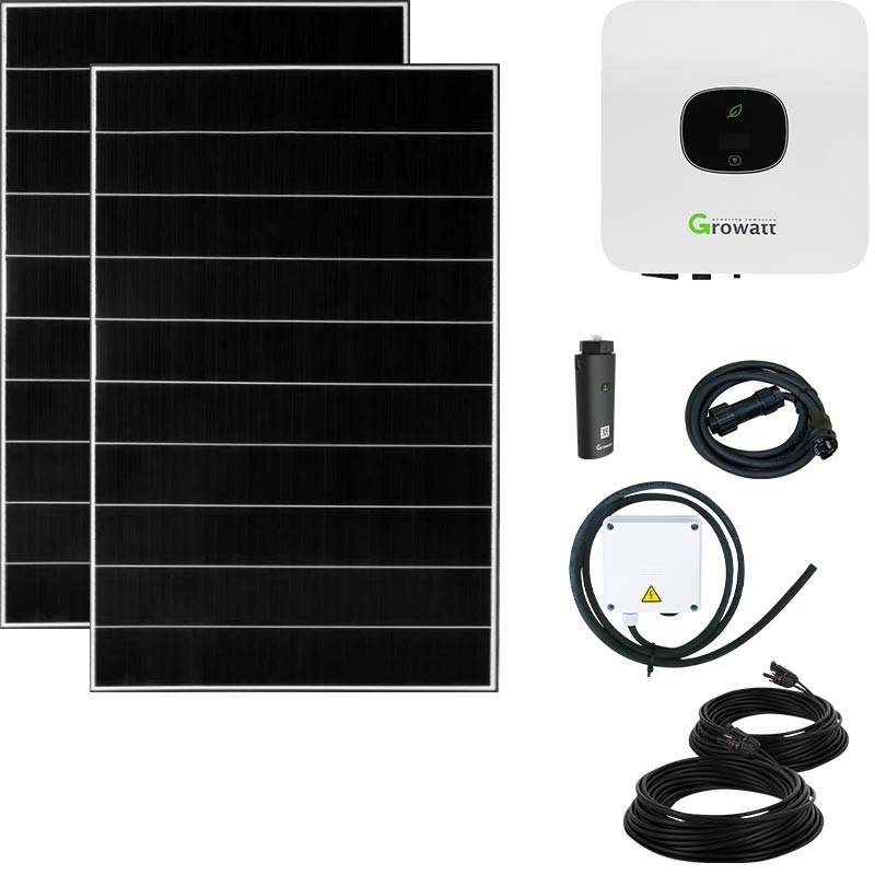 | Lieferumfang | 2 Stück 400 Watt Solarmodul monokristallin Schindel, Black 1 Paar 15 Meter 4 mm² Solarstringkabel zum Wechselrichter 1 Stück Einspeisesteckdose Aufputz inkl 2 Meter Kabel 1 Stück Wechselrichter Growatt MIC 600TL-X inkl 3 Meter Adapterkabel mit Einspeisestecker 1 Stück Wifi Modul zur Internetüberwachung |