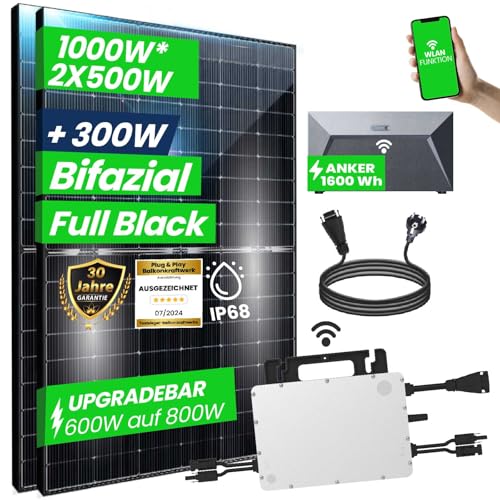 in PV-Anlagen und BalkonkraftwerkeAnker Balkonkraftwerk mit Speicher Komplettset 1000W Bifazial | Hoymiles Wechselrichter 800W | Photovoltaik Solaranlage mit 1,6 kWh Solarspeicher in Schwarz