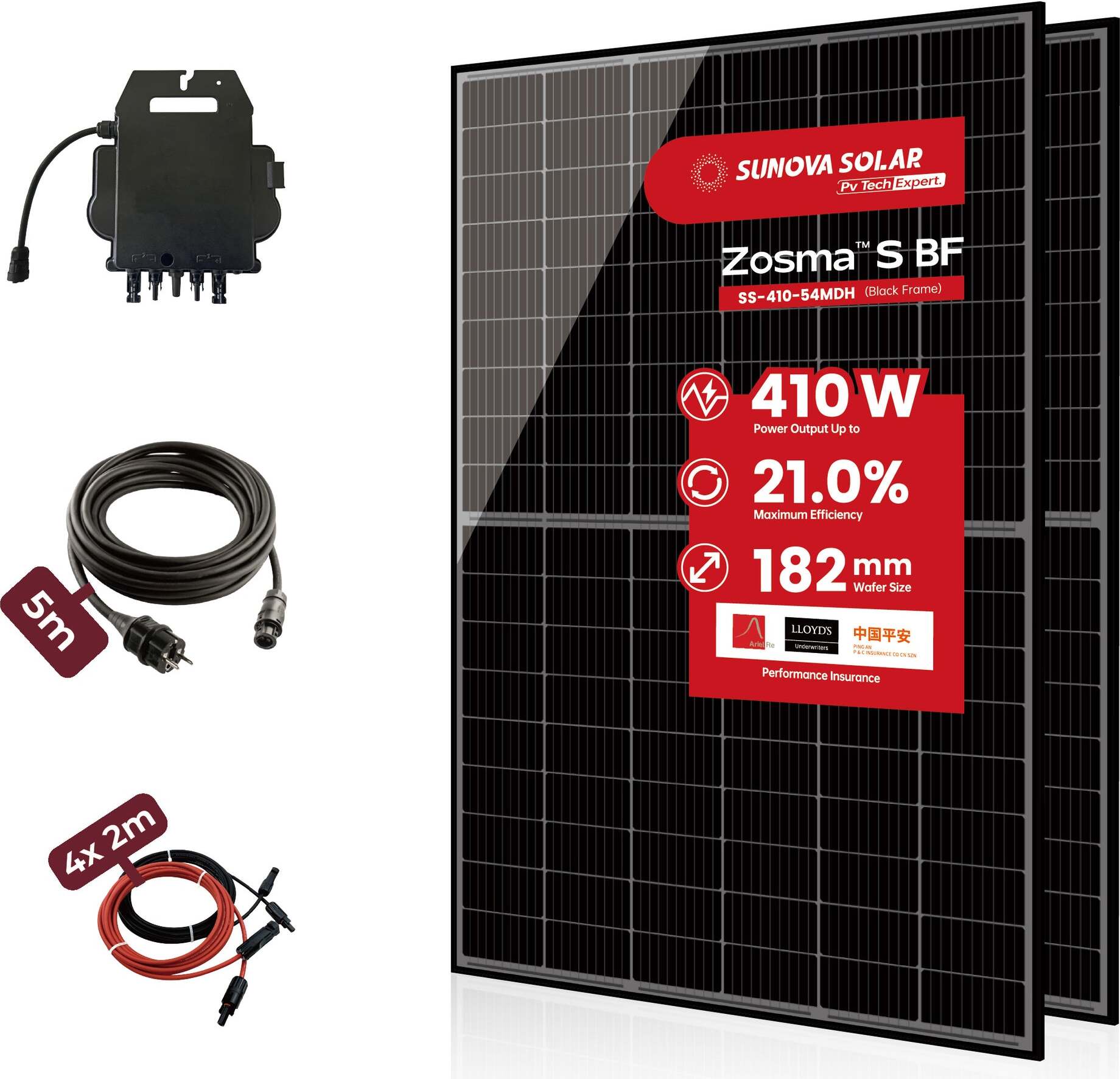 - Das Balkonkraftwerk 820 Watt Set beinhaltet zwei 410W Mono-PERC Solarmodule von Sunova Solar, einen Wechselrichter von APsystems und 10 Meter Schukokabel