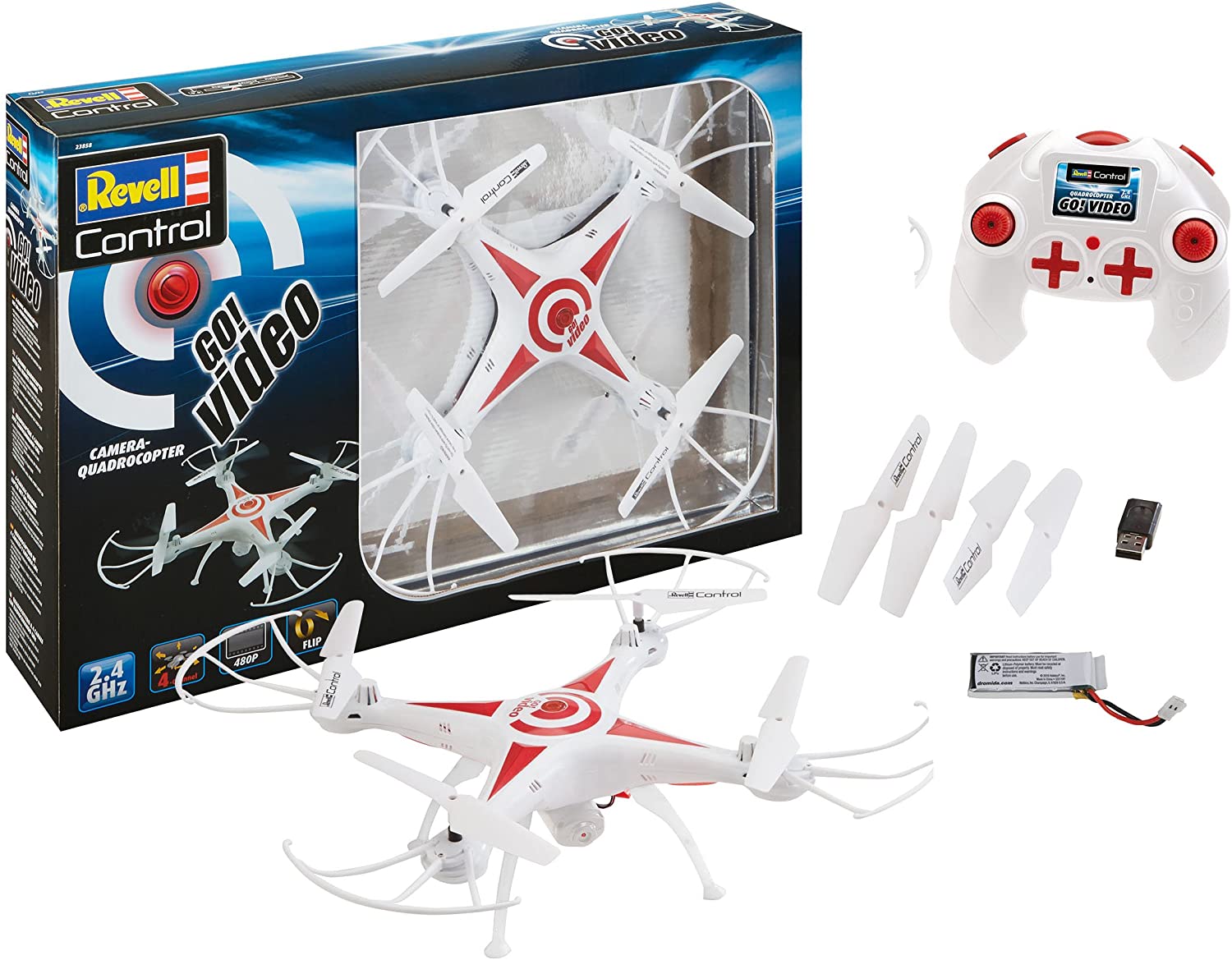 | Name | Revell Control 23858 RC Kamera-Quadcopter GO! Video, 2.4GHz, Akku, Flip-Funktion, Rotorschutz, LED, Headless-Mode, Geschwindigkeitsstufen, ferngesteuerter Quadrokopter, weiß, 31 cm |