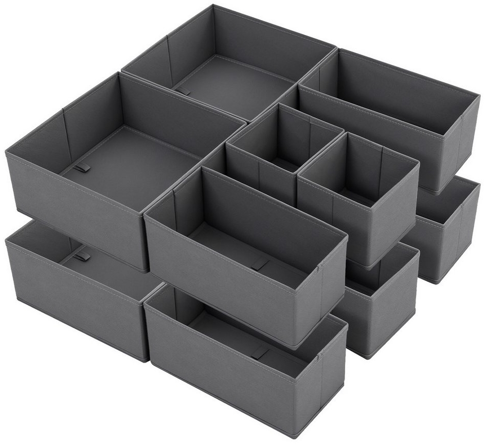 Praktisches 6er Set Aufbewahrungsboxen L aus robustem Vliesstoff für mehr Ordnung in Ihrem Zuhause. Mit den Maßen 30 x 30 x 10 cm, 15 x 30 x 10 cm und 15 x 15 x 10 cm (je 2 Stück) bieten die Boxen ausreichend Stauraum für Kleidung, Unterwäsche, Accessoires, Spielzeug oder Dokumente. Die faltbaren Boxen sind formstabil dank Kartoneinsatz und lassen sich bei Nichtgebrauch platzsparend verstauen. **Highlights** - Robuster Vliesstoff für langlebige Nutzung - Faltbar für platzsparende Aufbewahrung - Offenes Design für einfachen Zugriff - Ideal für Schubladen und Regale - Sofort einsatzbereit – kein Werkzeug erforderlich **Produkteigenschaften** - Maße: 30 x 30 x 10 cm × 2, 15 x 30 x 10 cm × 2, 15 x 15 x 10 cm × 2 - Setumfang: 6er Set Aufbewahrungsboxen L - Farbe: Anthrazit - Material: 80 g/m² Vliesstoff mit Kartoneinsatz - Einsatzbereiche: Kleidung, Unterwäsche, Accessoires, Spielzeug, Dokumente **Lieferumfang** - 1x6er Set Aufbewahrungsbox (L)