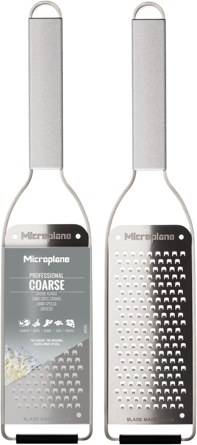 Deine neue grobe Reibe ist aus der neuen Professional Serie von Microplane und auch als Coarse Klinge bekannt. Sie ist die ideale Wahl für eine Vielzahl von Zutaten. Ob Hartkäse, Karotten, Kokos, Ingwer oder Meerrettich – mit dieser Reibe lassen sich Lebensmittel mühelos und gleichmäßig verarbeiten. Besonders praktisch: Zwiebeln, Schalotten, Knoblauch oder Ingwer können so fein gerieben werden, dass sie eine cremige Konsistenz erhalten und sich perfekt mit anderen Zutaten vermischen. Das sorgt für ein intensives Aroma und eine gleichmäßige Geschmacksverteilung in herzhaften und süßen Speisen. Ob für einen deftigen Eintopf, eine würzige Suppe oder einen vitaminreichen Salat – die Microplane Grobe Reibe ist ein unverzichtbares Küchenwerkzeug für alle, die Wert auf perfekte Ergebnisse und volles Aroma legen. Deine Vorteile bei der Microplane Reibe Grob Professional Serierasiermesserscharfe und langlebige Reibekomplett aus hochwertigem Edelstahl Geruchs- und Geschmacksneutral photo-geätzte Edelstahlklinge Rutschfester Gummifußergonomisch gestaltete Griff Made in USA Lieferumfang:1x Microplane Reibe Grob Professional Serie ✔