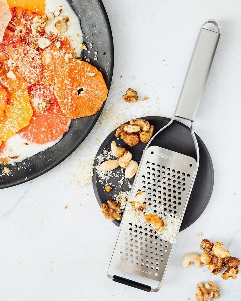 - Die Grobreibe PROFESSIONAL von Microplane ist aus photogeätztem Edelstahl gefertigt, was ihr eine robuste und langlebige Reibefläche verleiht.