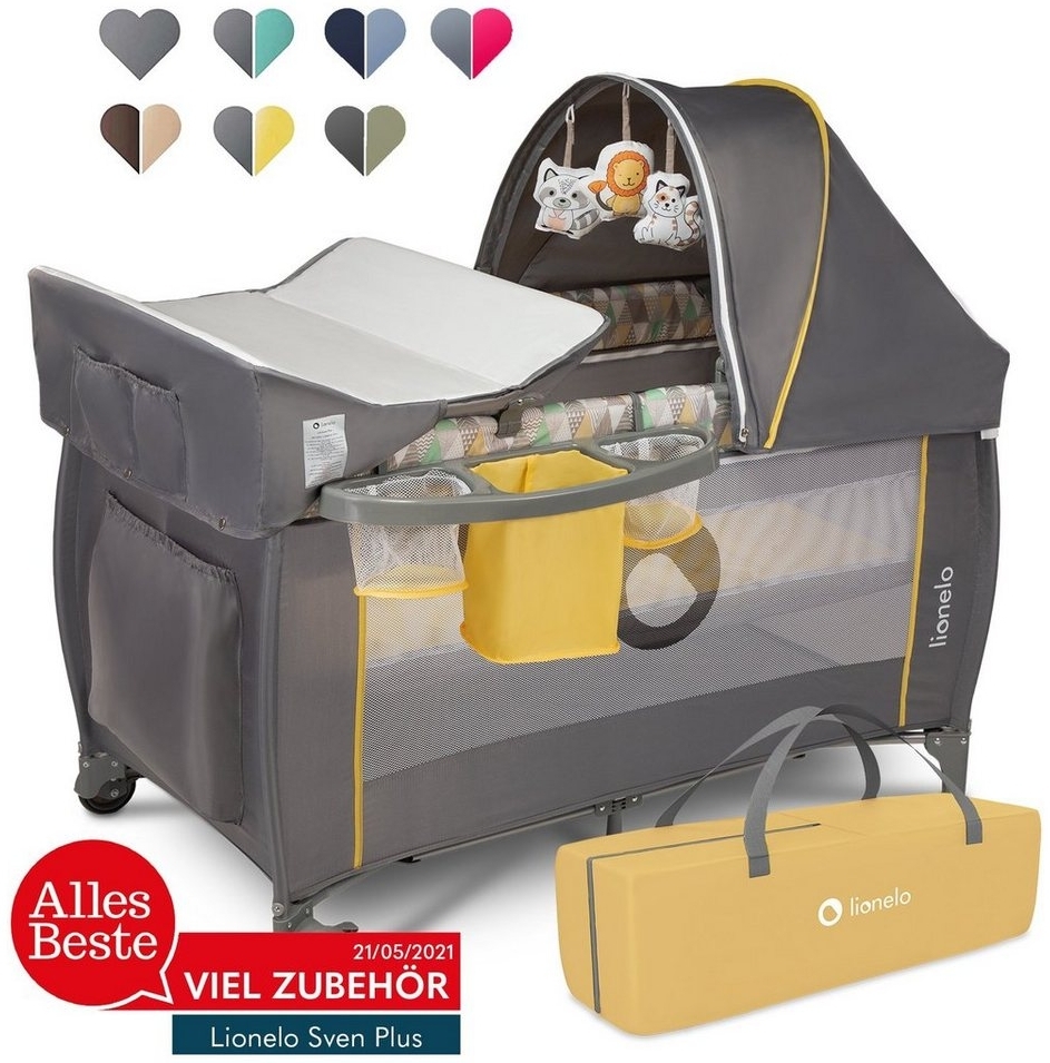 Lionelo Babybett / Reisebett in GELB | mit Wickeltisch, Moskitonetz und viel Zubehör | 12,7kg Gesamtgewicht | für Kinder von 0-3 Jahren | belastbar bis 15kg | umfangreiches Zubehör