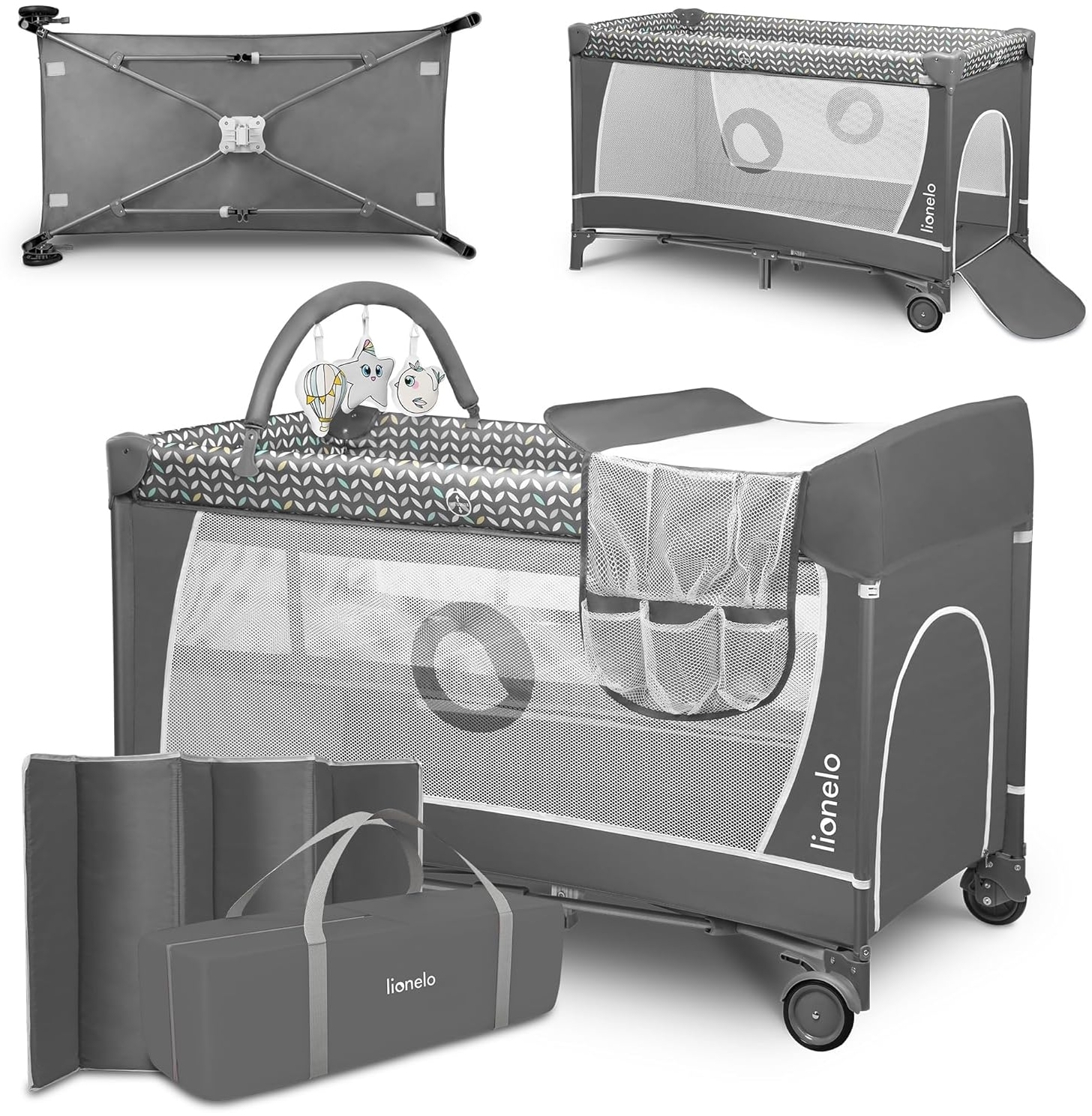 Das Reisebett FLOWER in Grau im skandinavischen Design vereint Funktionalität und Sicherheit. Es dient als Reisebett und Laufstall und bietet einen sicheren Wickeltisch mit Organizer. Mit einem interaktiven Spielbogen und zwei Matratzenaufhängungshöhen ist es ideal für Kinder von 0 bis 36 Monaten. Das LockGuard-System schützt vor versehentlichem Zusammenklappen, während die beweglichen Rollen für Mobilität sorgen. **Highlights** - 2 in 1: Reisebett plus Laufstall - Sicherer Wickeltisch mit Organizer - Spielbogen mit interaktivem Spielzeug - LockGuard Faltschutz für erhöhte Sicherheit - Schnelles Entfaltungs- und Faltsystem **Produkteigenschaften** - Abmessungen nach dem Entfalten: 125 x 65 x 76 cm - Abmessungen nach dem Falten: 22 x 23 x 80 cm - Maximales Kindergewicht: 9/15 kg - Wickelauflage: bis zum 12. Lebensmonat, maximales Gewicht 11 kg - Material: Stahl, Kunststoff, 100% Polyester - Zwei Matratzenaufhängungshöhen - Seiteneingang mit Reißverschluss für ältere Kinder - Bewegliche Rollen für Mobilität **Lieferumfang** - Reisebett FLOWER - Tragetasche - Wickelauflage