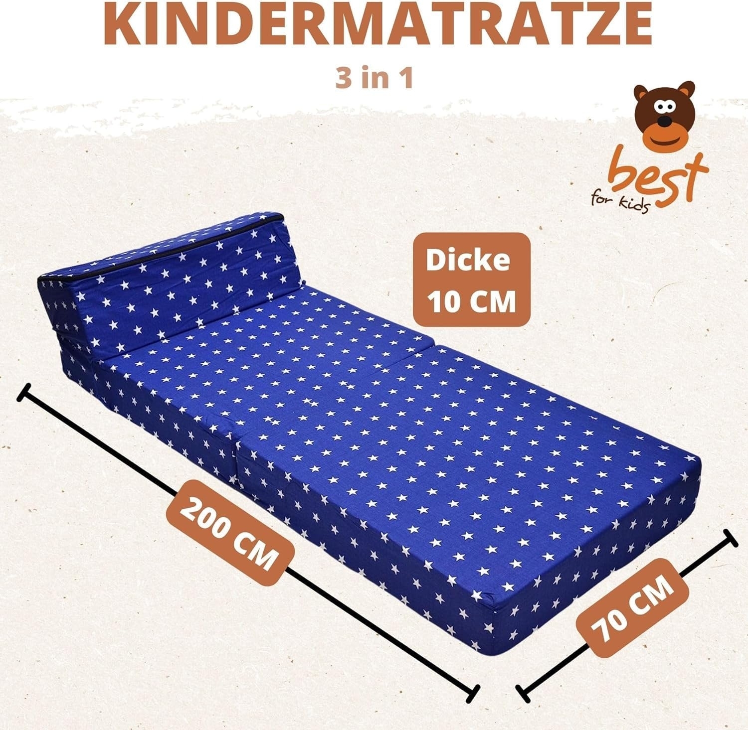 Best For Kids Kindersessel/Reisebettmatratze 3-in-1 in Blau ist die perfekte Ergänzung für jedes Kinderzimmer. Dieses vielseitige Möbelstück kann als Beistellcouch, temporäre Liegefläche oder Spielsofa genutzt werden. Es bietet ausreichend Platz zum Kuscheln, Vorlesen und Entspannen. Dank der kompakten Größe und der einfachen Klappfunktion lässt es sich mühelos in jedem Raum aufstellen. **Highlights** - 3-in-1 Funktion: Kindersessel, Beistellcouch und Liegefläche - Leicht und einfach zusammenklappbar für flexiblen Einsatz - Hohe Rückenlehne und weiche Armlehnen für optimalen Komfort - Sicheres Design ohne gefährliche Teile - Langlebige, fest verbundene Schaumstoffstücke **Produkteigenschaften** - Farbe: Blau - Material: Hochwertiger Strukturstoff - Geeignet für Babys und größere Kinder - Bietet Platz zum Kuscheln und Spielen - Leicht zu bewegen und zu handhaben