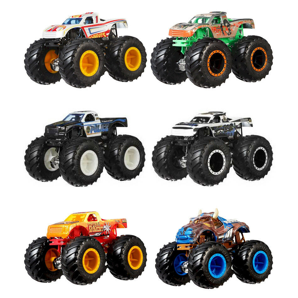 | Name | Hot Wheels 2019 Monster Trucks Demolition Doubles Police VS Hooligan Giant Wheels 1:64, sortiert, 1 Set mit 2 Fahrzeugen, zufällige Auswahl, keine Vorauswahl möglich |