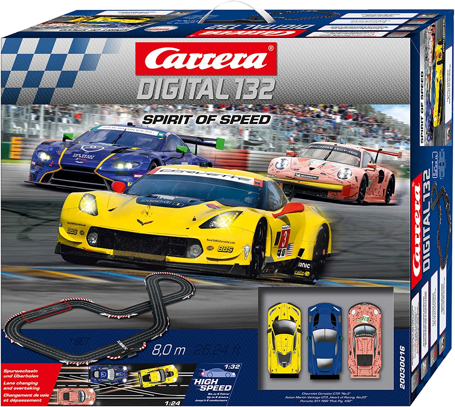 - Spirit of Speed - Carrera DIGITAL 132 - Porsche, Corvette und Aston Martin Vantage in einem Set - Maßstab 1:32 - Ab 8 Jahren **Drei-Länder-Action** Das internationale Duell wird im Carrera DIGITAL 132 "Spirit of Speed"-Set ausgetragen. Hier gehen der Männertraum Chevrolet Corvette C7.R „No.3", der kultige Porsche 911 RSR „Pink Pig Design, No.92" und der elegante Aston Martin Vantage GT3 „Heart of Racing, No.23" an den Start. Mit dieser hochklassigen Auswahl an Top-Sportwagen begeisterst du deine Freude im gemeinsamen Rennen. Auf der ca. 8 Meter langen Rennstrecke warten so heiße Duelle und jede Menge Action auf euch. **Hier werden Auto-Träume wahr** Die mächtigen Boliden sind wahre Traumautos der Autobauer aus drei verschiedenen Ländern und zeigen auf der 8 Meter langen Carrera Rennstrecke, was Speed heißt. Nun hast du die Chance, im heimischen Wohnzimmer-Duell zu zeigen, wie viel Power unter der Haube steckt. Auf jeder Menge langer Geraden hast du gerade genug Zeit, das Maximum aus den schnittigen Flitzern herauszuholen.