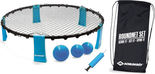 Der neue ultimative neue Fun-Sport für jung und alt, für Freunde oder Familie. Am Strand, im Park oder auch Indoor: das rasante Spiel begeistert jeden man findet schnell interessierte Mitspieler. Zwei Teams mit je 2 Spielern treten gegeneinander an. Alle stehen gleichmäßig verteilt um das Netz herum. Zum Aufschlag wird der Ball mit der flachen Hand auf das Netz geschlagen, so dass er in die gegnerische Seite fliegt. Das gegnerische Team darf sich nun den Ball bis zu zwei Mal gegenseitig zu zuspielen, bevor er wieder ins Netz geschlagen werden muss. Ziel ist es, dass der so geschlagene Ball möglichst nicht von der gegnerischen Mannschaft erreicht wird. Nach dem Aufschlag darf sich jeder Spieler völlig frei rund um das Netz bewegen. Dies macht das Spiel so rasant. Mit kurzen und langen Pässen, mit vorgetäuschten Angriffen und anderen Tricks versucht man den Gegner aus der Reserve zu locken. Schafft dieser es nicht den Ball zurückzuspielen und fällt der Ball auf den Boden, bekommt das eigene Team 1 Punkt. Sobald ein Spieler behindert wird, erhält dieser ebenfalls 1 Punkt. Wer als erster 21 Punkte erreicht hat und dabei mit 2 Punkten Abstand in Führung ist, hat das Match gewonnen. **Das Set beinhaltet:** - komplettes Roundnet Netz ( 90cm, ca. 20cm hoch) - 1 Trainingsball ( 11cm) - 2 Wettkampfbälle ( 9cm, 0,5 bar) - Ballpumpe mit Nadel - Netztasche zum Verstauen und Transport - Gewicht komplettes Set: 1,4kg