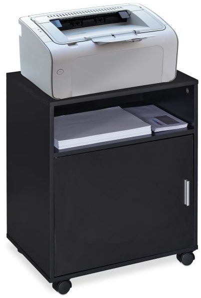 Effektives Arbeiten beginnt mit dem praktischen Rollcontainer, der über 3 Fächer verfügt. Mit einer Größe von ca. 57 x 48 x 34 cm bietet er ausreichend Platz für Ihren Drucker und weiteres Bürozubehör. Die mobile Bauweise mit 360° drehbaren Laufrollen ermöglicht eine flexible Nutzung im Büro oder Arbeitszimmer. **Highlights** - Obere Ablage ideal für den Drucker - Viel Stauraum für Büroutensilien - Höhe der Einlegeböden selbst wählbar - 360° drehbare Laufrollen mit Bremse - Traglast obere Ablage: ca. 15 kg **Produkteigenschaften** - Größe H x B x T: ca. 57 x 48 x 34 cm - Traglast je Fach: ca. 10 kg - Gewicht: ca. 10,5 kg - Material: Spanplatte, Kunststoff - Farbe: Schwarz - Offenes Fach H x B x T: ca. 13,5 x 45 x 32,5 cm - Oberes Schrankfach B x T: ca. 45,5 x 30,5 cm - Unteres Schrankfach B x T: ca. 45,5 x 32,5 cm - Höhe des Einlegebodens: ca. 13,5, 17, 20 cm **Lieferumfang** - 1x Rollcontainer in Einzelteilen - Mit Montagematerial - Mit Anleitung - Dekoartikel sind im Lieferumfang nicht enthalten