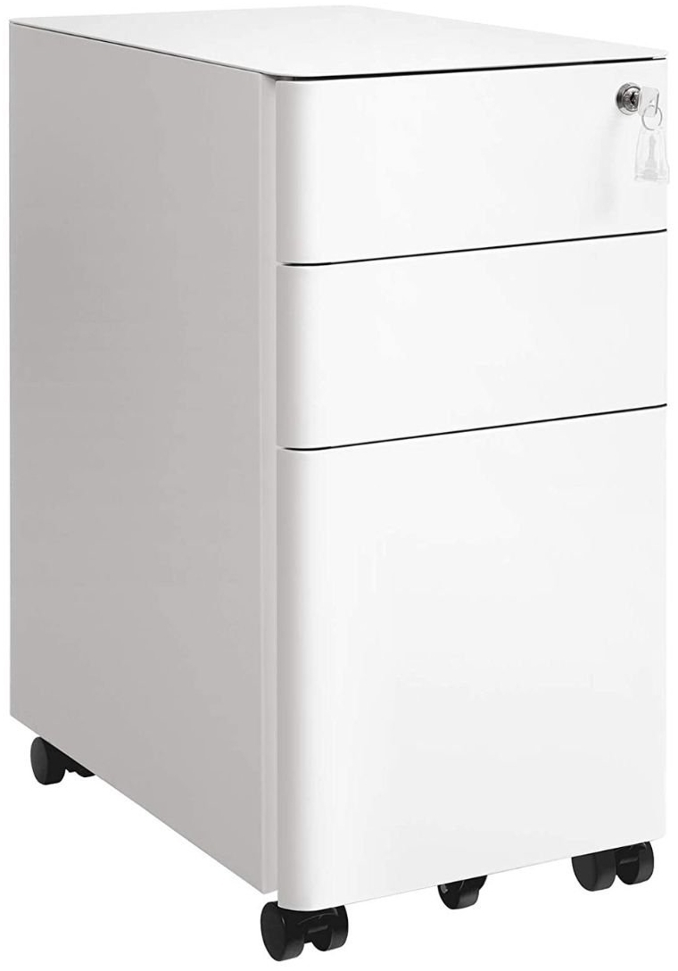 - Alles an einem Platz: Versinkt Ihr Büro im Chaos? Dieser Schrank (30 x 46 x 59,2 cm) bietet viel Stauraum, aber nimmt nur wenig Fläche ein. Sie können Akten in verschiedenen Formaten (A4-, Letter- oder Legal-Format) in den 3 Schubladen verstauen - Bereits vormontiert: Dank des vormontierten Korpus müssen Sie nur die 5 Rollen (eine vorne unten an der Schublade zum Schutz vorm Umkippen) anbringen, schon steht Ihnen der flexible Rollcontainer zur Verfügung - Langlebig? Kein Zweifel: Dieser Rollcontainer aus Metall bietet eine hohe Robustheit. Jede der beiden oberen Schubladen ist bis 15 kg belastbar und die große untere Schublade ist bis 20 kg belastbar – Legen Sie ruhig all Ihre Akten hinein - Alles in Sicherheit: Möchten Sie Dokumente an einem sicheren Platz aufbewahren? Warum schließen Sie sie nicht in dieses Schränkchen ein? Ohne Griff, ganz geschmeidig – Ziehen Sie einfach an den Seiten! Die abgerundeten Ecken schützen vor Anstoßen - Was Sie bekommen: Einen SONGMICS Aktenschrank mit 3 Schubladen, 1 Schubladen-Einsatz für Büroutensilien, 1 Hängeregistratur und 5 Rollen, 2 davon mit Bremsen für zusätzlichen Halt. Die extra Rolle vorne an der Schublade schützt vor Umkippen AbschließbarWichtige Dokumente können sicher im Büro, fern von fremden Händen, oder im Arbeitszimmer, fern von wilden Kindern, aufbewahrt werden. | Reibungslose GleitschienenDie hochwertigen Gleitschienen lassen sich auch voll beladen leicht herausziehen, was den Zugriff auf Gegenstände erleichtert. | 360° drehbare RollenAusgestattet mit 5 Rollen, 2 davon arretierbar, ist dieser Schrank sowohl mobil als auch standhaft. Die Rolle vorne unter der Schublade bietet zusätzliche Stabilität. Etwas Gutes für Ihren Arbeitsbereich: Haben Sie es satt, Aktenstapel zu durchforsten, um das dringend benötigte Dokument zu finden? Und wo war denn nochmal der Bleistift? Dieser SONGMICS Aktenschrank schluckt mit seinen 3 Schubladen und 1 Schubladen-Einsatz für Büroutensilien das Chaos auf Ihrem Schrank! Außerdem können Sie hinter dem Schloss wichtige Dokumente sicher im Büro aufbewahren. Ausgezeichnete Produkte: Machen Sie sich keine Sorgen über die Standfestigkeit dieses Aktenschranks! Die zwei Schubladen oben sind jeweils bis 15 kg belastbar und die untere Schublade mit Hängeregistratur kann bis zu 20 kg tragen. Mit Premium-Vollauszügen lassen sich die Schubladen auch bei hoher Belastung leicht ausziehen. Der Aktenschrank ist mit 5 Rollen ausgestattet, sodass er leicht überallhin geschoben werden kann. **Produktdetails:** - Farbe: Weiß - Material: Stahl - Größe: 30 x 46 x 59,2 cm (L x B x H) - Gewicht: 17,2 kg - Max. statische Belastbarkeit der oberen 2 Schubladen: Je 15 kg - Max. statische Belastbarkeit der unteren Schublade: 20 kg **Lieferumfang:** - 1 x Aktenschrank - 1 x Schubladen-Einsatz für Büroutensilien - 1 x Hängeregistratur - 1 x Zubehörpaket - 1 x Anleitung **SONGMICS Hinweise:** - Bitte überschreiten Sie das Maximalgewicht pro Schublade nicht. - Kindern ist es untersagt, auf das Produkt zu klettern oder mit ihm zu spielen, um durch ein Umkippen verursachte Verletzungen zu vermeiden.