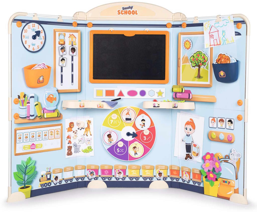 Smoby Schule, das Klassenzimmer für Kinder ab drei Jahren. Hier kann der Nachwuchs kreativ einen typischen Tag in der Vorschule erleben. Dank der vielen Spielmöglichkeiten können die Kids sowohl in die Rolle des Lehrers als auch des Schülers schlüpfen und trainieren so spielerisch ihre kognitiven Fähigkeiten - die ideale Vorbereitung auf die Grundschule. Ebenfalls können die Kinder auch Kindergarten spielen, denn auch im Morgenkreis werden tägliche Rituale wie wer ist heute alles da, wie ist das Wetter, welcher Wochentag ist heute praktiziert. Ein rundum gelungenes Produkt. Die Smoby School besteht aus drei Flügeln, die aus hochwertigen Karton-Teilen zusammengefügt und von einem stabilen Metallrahmen eingefasst werden. Nach dem Spielen lässt sich die Schule wieder platzsparend verräumen. Die Regale geben der Spielwand zusätzliche Stabilität und dienen zum Verstauen des Zubehörs. Spiele: Tafel zum Schreiben, Malen und Rechnen. Lernuhr mit drehbaren Zeigern. Individualisierbare Namens-Kärtchen, die die An- oder Abwesenheit anzeigen. Anzeige der Wochentage. Rad, mit dem sich die Tages-Aktivitäten anzeigen lassen. Geburtstagszug mit den einzelnen Monaten. Wetter-Baum zum Lernen der Jahreszeiten und des Wetters. Karten zum Bestimmen der Körperteile. Klemmen zum Befestigen von Blättern und Zeichnungen. Befestigung der Spielkarten mittels Klettpunkten. Zubehör: Tafel, Schwamm, abwaschbarer Filzstift, magnetische Zahlen und Buchstaben. Der Artikel wird in Frankreich hergestellt und muss selbst zusammengebaut werden. Maße: Die Schule ist ca. (Lx Bx H): 135 x 41 x 111 cm groß. Altersempfehlung: Geeignet für Kinder ab 3 Jahren. Sicherheitshinweis: Achtung! Nicht für Kinder unter 36 Monaten geeignet. Erstickungsgefahr durch verschluckbare Kleinteile.
