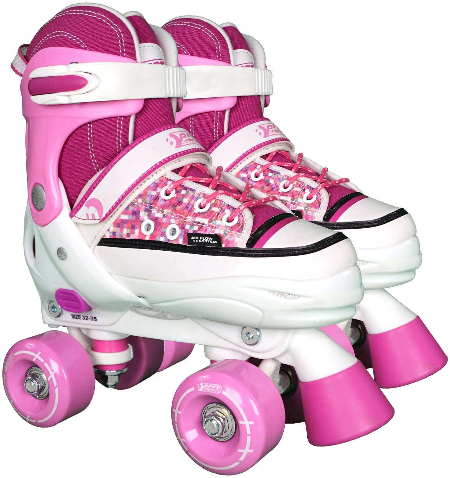 Die hochwertigen Best Sporting Rollerskates lassen sich jeweils in vier Schuh-Größen verstellen. Die ABEC 7 Carbon-Kugellager und die 82 A PU-Rollen sorgen für eine optimale Kraftübertragung. Die Polsterung aus Memory-Foam und die qualitativ hochwertigen EVA Innensohlen sorgen für besten Tragekomfort. Beidseitige Sicherheitsverschlüsse sorgen für einen hervorragenden Halt, ein leichter Einstieg wird ermöglicht durch eine Zusatz-Schlaufe im Knöchelbereich. Diese Quad-Style Rollschuhe mit hervorragender Passform und Stabilität sind in folgenden Größenvarianten erhältlich, die sich mittels eines seitlichen Druckknopfes jeweils in 4 Schritten individuell in der Größe einstellen lassen: Schuhgröße 28 - 31 (max. Benutzergewicht 20 kg - 60 kg), Schuhgröße 32 - 35 (max. Benutzergewicht 20 kg - 60 kg), Schuhgröße 36 - 39 (max. Benutzergewicht 20 kg - 100 kg). Achtung: Mit Schutzausrüstung zu benutzen. Nicht im Straßenverkehr zu verwenden. Farbe: pink-weiß, Schuhmaterial: Kunstleder mit Zehenkappe aus Nylon, Rollen: 58 x 33mm, 82 A, Memory-Foam und EVA Innensohle, Rollen aus PU, casted wheels, PP High Impact Chassis und Truck PP Schale + Cuff PU Stopper, seitliches Druckknopfsystem, beidseitiger Sicherheitsverschluß (double end security lock), Lieferumfang: 1 Paar Rollschuhe Nutzergewicht: Max. 100 kg. Achtung: Mit Schutzausrüstung zu benutzen. Nicht im Straßenverkehr zu verwenden.