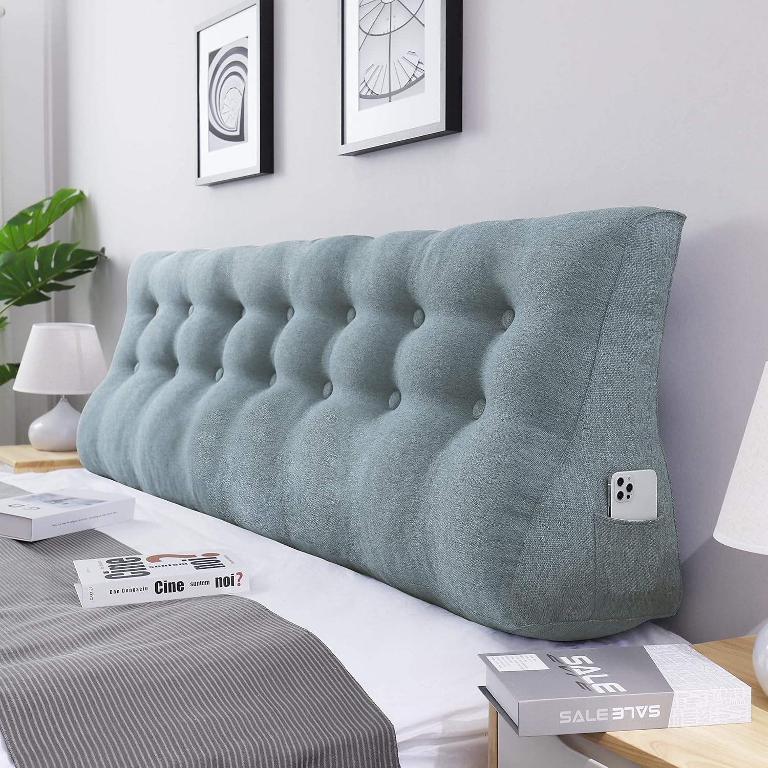 VERCART Keil-Lesekissendreieckig, Bettstütze, Rückenlehne, Kopfteil, Rückenstütze, dekoratives Kissen, grauer Leinen-Mix, 200 x 25 x 55 cm