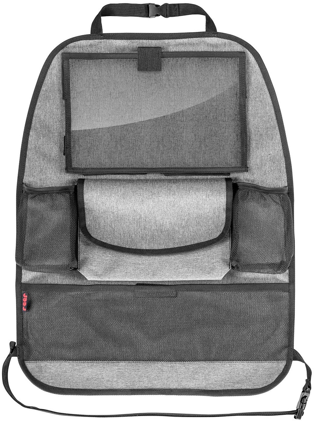 - Der reer 86051 TravelKid Entertain Autorücksitz-Organizer ist in einem praktischen grauen Design gehalten, das an den Vordersitzen des Autos befestigt wird.