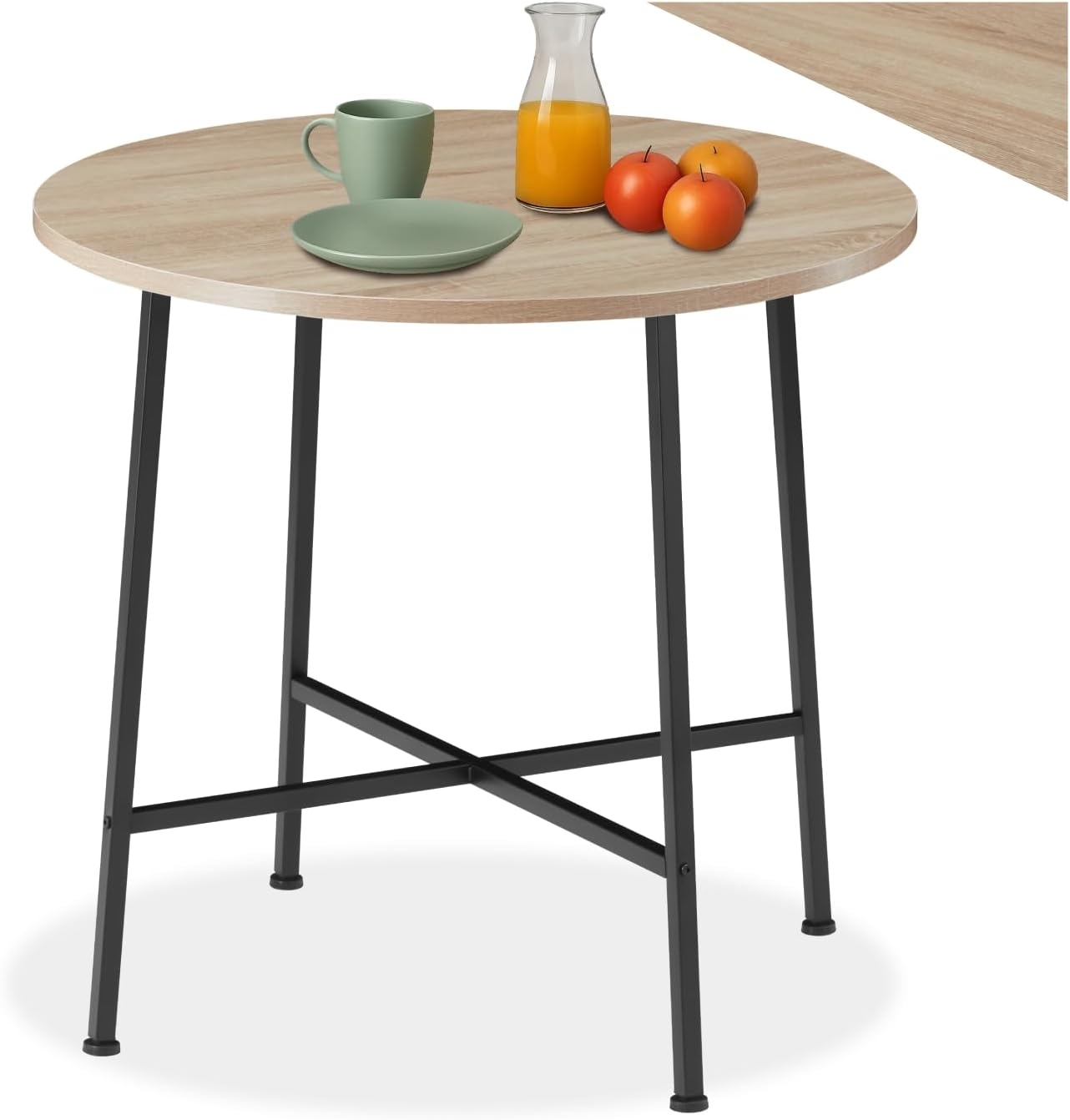 Der runde Esstisch Ennis von tectake vereint charmanten Industrial Style mit Funktionalität. Die pflegeleichte MDF-Platte mit schöner Maserung und das stabile Stahlgestell sorgen für ein dekoratives Element in Ihrer Wohnung. Mit einem Durchmesser von ca. 80 cm und einer Höhe von ca. 76 cm ist dieser Tisch ideal für verschiedene Wohnstile. Die verstellbaren Füße gleichen Bodenunebenheiten aus und bieten eine Belastbarkeit von bis zu 75 kg. **Highlights** - Charmanter Industrial Style - Pflegeleichte MDF-Platte mit schöner Maserung - Stabiles Stahlgestell für hohe Standfestigkeit - Verstellbare Kunststofffüße zur Anpassung an Bodenunebenheiten - Belastbarkeit von bis zu 75 kg **Produkteigenschaften** - Totalmaße (ØxH): ca. 80 x 76 cm - Dicke der MDF-Platte: ca. 1,5 cm - Abstand zwischen unteren Querstreben und Boden: ca. 21 cm - Stahlgestell (BxT): ca. 2 x 2 cm - Verstellbarkeit der Kunststofffüße: ca. 1,5 cm - Gewicht: ca. 7,5 kg - Material: MDF-Platte, pulverbeschichteter Stahl, Polyethylen **Lieferumfang** - Esstisch - Montagematerial - Montageanleitung