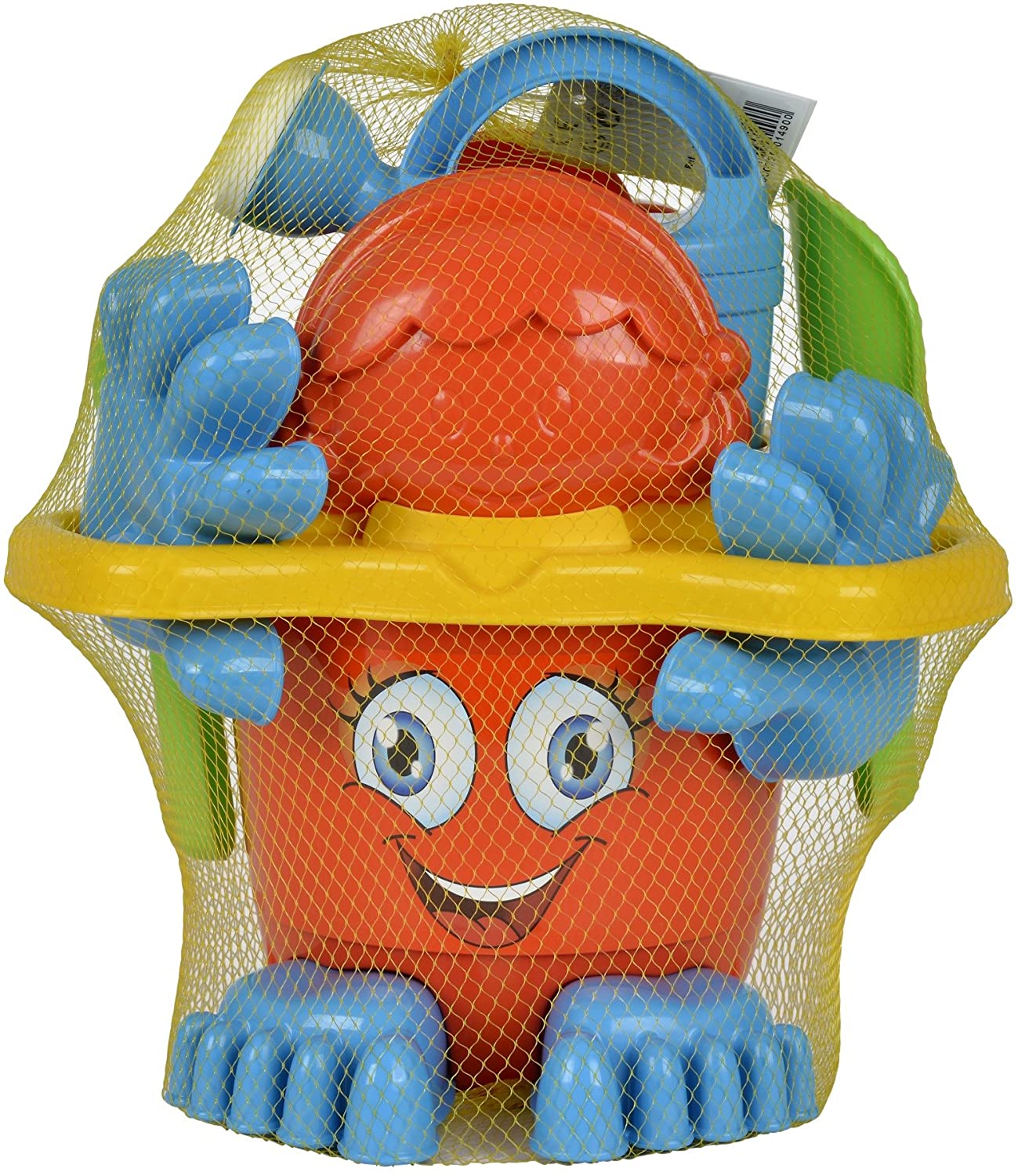 - Der Eimer hat ein lustiges Gesicht und die Hände sowie Füße dienen als Sandförmchen.