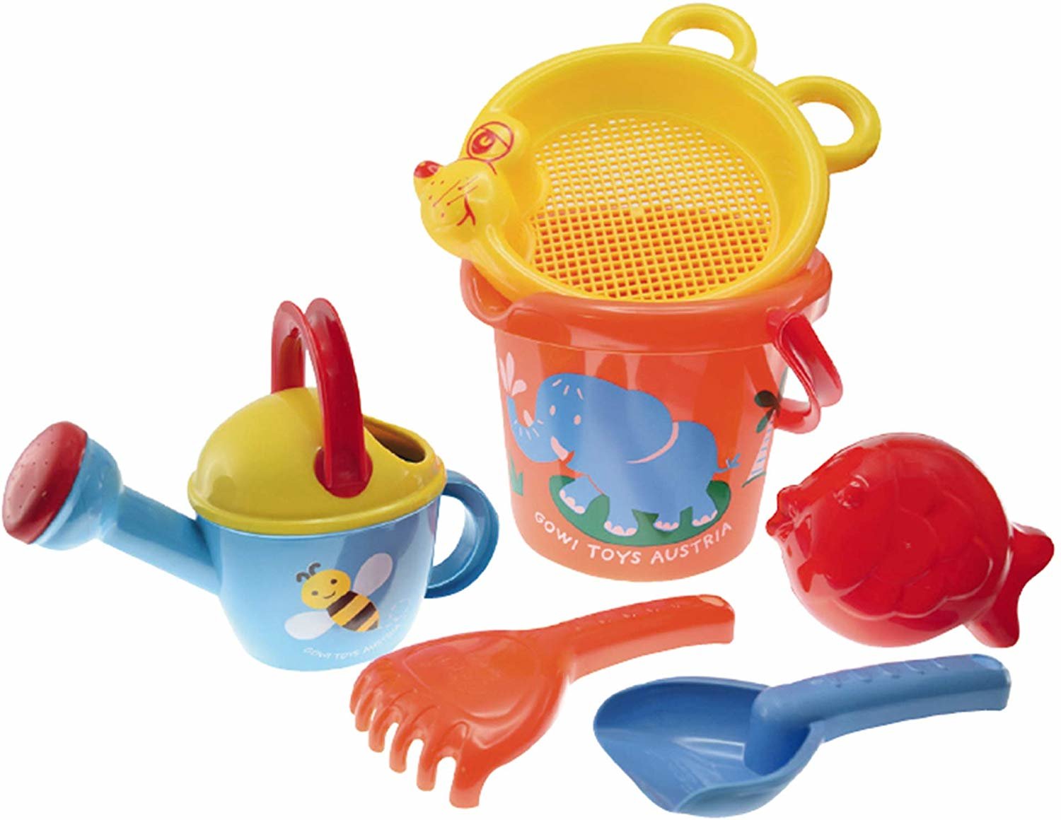 - Das Gowi-Sandspielzeug-Set Maus besteht aus insgesamt 6 Teilen, darunter ein Eimer, ein Sieb, ein Gießer, eine Form, eine Schaufel und ein Rechen.
