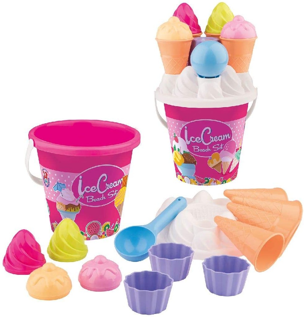 - Die Eimergarnitur Eis von Simba enthält insgesamt 14 Teile, darunter einen Eimer, ein Sieb und 11 Sandformen.
