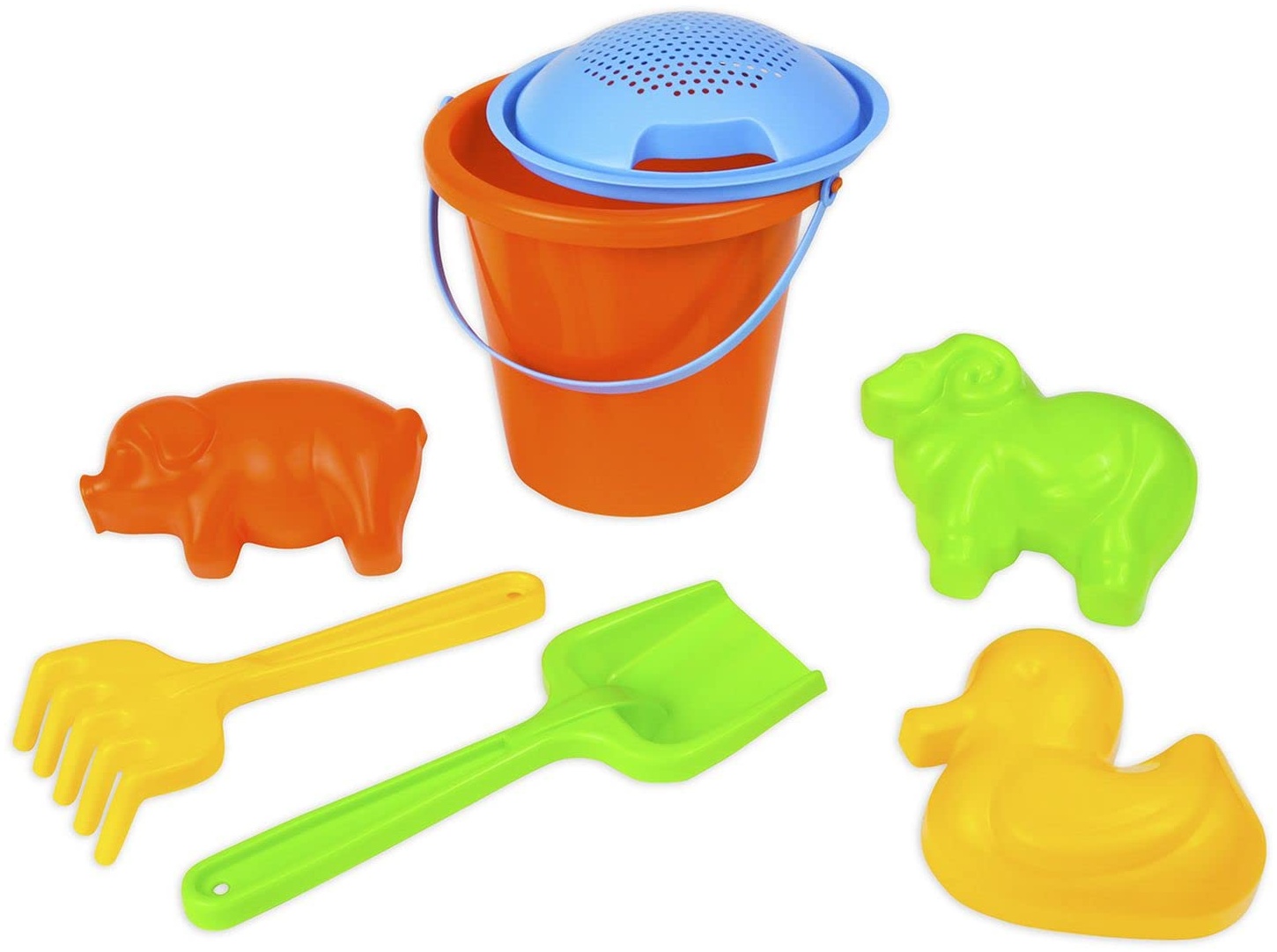 - Das Set enthält zusätzlich ein Sieb, eine Schaufel, einen Rechen und drei Tier-Förmchen.