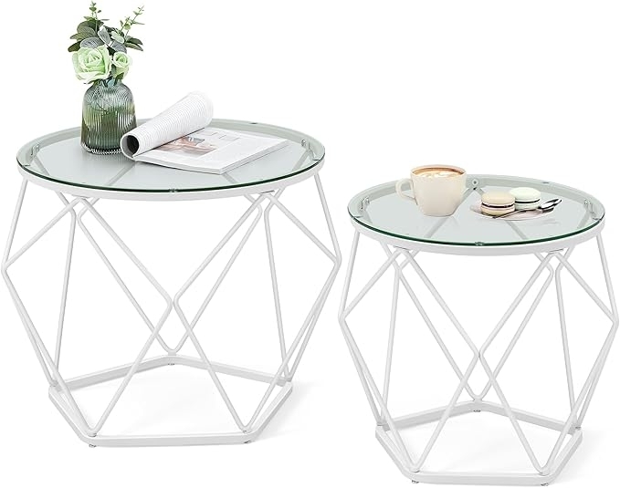 Vasagle Couchtisch rund im 2er Set vereint modernes Design mit praktischer Funktionalität. Die Tische bestehen aus hochwertigem Hartglas und robuster Stahlkonstruktion, die eine maximale Belastbarkeit von 20 kg pro Tisch bieten. Mit einem großen Tisch von 50 x 40 cm und einem kleinen Tisch von 40 x 36 cm sind sie ideal für kleine Räume. Die abnehmbare Tischplatte kann auch als Tablett verwendet werden. **Highlights** - Praktische Größe für kleine Räume - Einfache Montage mit klarer Anleitung - Robuste und stabile Konstruktion - Vielseitig nutzbar, zusammen oder getrennt - Moderner Stil mit transparentem Design **Produkteigenschaften** - Farbe: Transparent-Wolkenweiß - Material: Hartglas, Stahl - Größe des großen Tisches: 50 x 40 cm (Ø x H) - Größe des kleinen Tisches: 40 x 36 cm (Ø x H) - Gewicht insgesamt: 7 kg - Max. statische Belastbarkeit pro Tisch: 20 kg **Lieferumfang** - 1 x großer Beistelltisch - 1 x kleiner Beistelltisch - 1 x Zubehörpaket - 1 x Anleitung