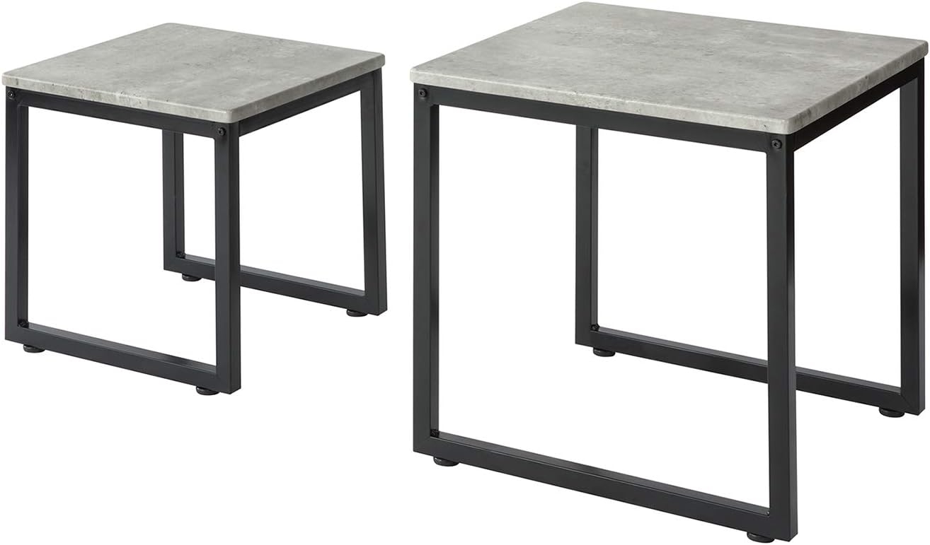 Praktisches 2er Set Couchtische für Ihr Wohnzimmer. Die Tische bestehen aus robustem Span in Grau-Optik und einem stabilen Eisen-Gestell in Schwarz. Sie können die Tische einzeln oder zusammen verwenden, um Snacks, Getränke oder Bücher griffbereit zu haben. **Highlights** - Funktionell: Einzeln oder zusammen verwendbar - Belastbarkeit: 20 kg pro Beistelltisch - Material: Span mit Grau-Optik - Gestell: Eisen, schwarz - Leichtgewichtig: ca. 11 kg **Produkteigenschaften** - Produktmaße großer Tisch: B 50 x T 50 x H 50 cm - Produktmaße kleiner Tisch: B 40 x T 40 x H 40 cm - Paketmaße: 58 x 57 x 14,5 cm - Lieferzustand: zerlegt und praktisch verpackt **Lieferumfang** - 2 Beistelltische (zerlegt) - Keine weiteren Produkte enthalten