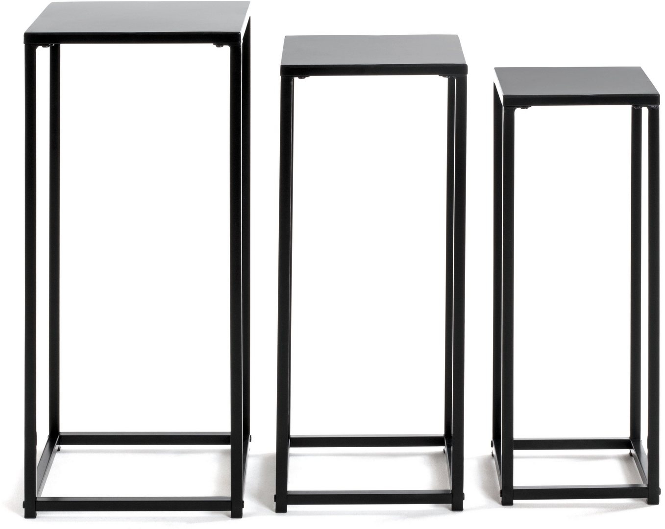 aus Stahlrohr in schwarz pulverbeschichtet Ablagen aus Metall in schwarz Maße kleiner Tisch: T 22 x B 22 x H 61 cm Maße mittlerer Tisch: T 26 x B 26 x H 66 cm Maße großer Tisch: T 30 x B 30 x H 71 cm Belastbarkeit: pro Ablage jeweils 5 kg
