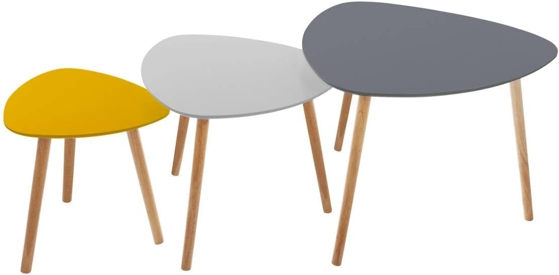 Set bestehend aus 3 Couchtischen Mileo Break - Model 3 von Atmosphera créateur d'intérieur. Die Tische sind in den Farben Gelb, Grau und Weiß erhältlich und bestehen aus MDF (Holzfaserplatte) mit Beinen aus Eiche. Die Maße der Tische sind: - S: 34 x 34 x 35 cm, Gewicht: 1,5 kg - M: 46,5 x 46,5 x 40 cm, Gewicht: 2,3 kg - L: 60 x 60 x 45 cm, Gewicht: 3,5 kg Die Selbstmontage ist erforderlich. **Highlights** - Set aus 3 Couchtischen für vielseitige Nutzung - Hochwertige Materialien: MDF und Eiche - Leichtgewichtig für einfache Handhabung - Modernes Design in Gelb, Grau und Weiß - Ideal für verschiedene Wohnstile **Produkteigenschaften** - Maße S: 34 x 34 x 35 cm, Gewicht: 1,5 kg - Maße M: 46,5 x 46,5 x 40 cm, Gewicht: 2,3 kg - Maße L: 60 x 60 x 45 cm, Gewicht: 3,5 kg - Material des Tisches: MDF (Holzfaserplatte) - Material der Beine: Eiche - Selbstmontage erforderlich **Lieferumfang** - 3 Couchtische (S, M, L) - Montagematerial und Anleitung