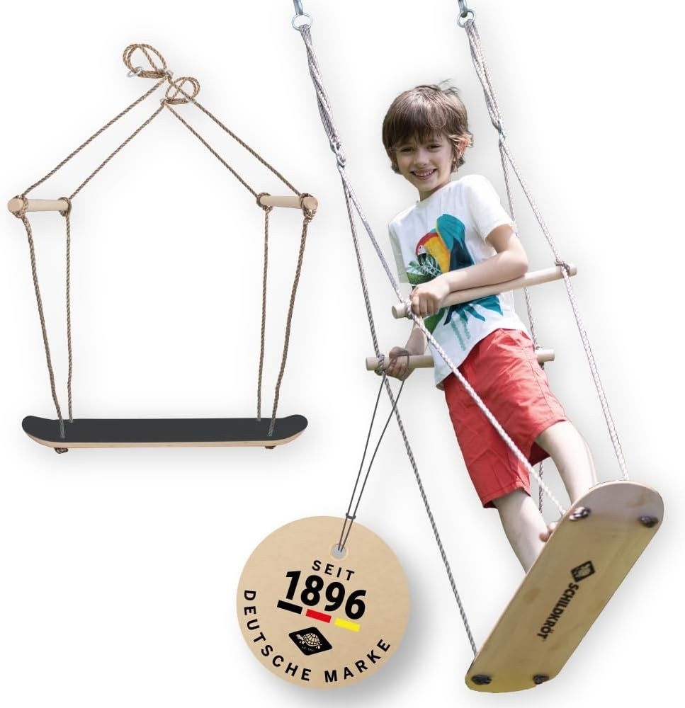 Die Schildkröt Skateboard Schaukel aus Holz (80 x 20 x 1,8 cm) ist ein außergewöhnliches Spielgerät, das Kindern und Erwachsenen gleichermaßen Spaß macht. Mit dieser Schaukel können Sie wie auf einem Skateboard stehend in der Luft skaten oder sitzend schaukeln. Die Schaukel erfordert Geschicklichkeit, Balance und Koordination und bietet somit eine tolle Herausforderung für alle Altersgruppen. Mit den 2 Rundstab-Haltegriffen (45cm x Ø 3cm) haben Sie immer einen sicheren Halt. Die Schaukel ist zwischen 73cm und 105cm höhenverstellbar und passt sich somit optimal an Ihre Bedürfnisse an. Das Board verfügt über eine 4mm starke EVA Oberfläche mit Anti-Rutsch Struktur, sodass Sie immer einen sicheren Stand haben. Die PE-Seile (Ø 10mm) sind bis zu einer Höhe von 160cm verstellbar und werden an den Halteringen befestigt. Die maximale Belastbarkeit beträgt 100kg. Die Schildkröt Skateboard Schaukel bietet vielfältige Einsatzmöglichkeiten und passt gut zu vielen Gärten. Die Schaukel wird montiert und inklusive Anleitung geliefert. **Highlights** - Außergewöhnliche Schaukel für Kinder und Erwachsene - Kann als Skateboard oder Schaukel verwendet werden - Höhenverstellbar von 73cm bis 105cm - Sichere Haltegriffe für einen festen Halt - Maximale Belastbarkeit von 100kg **Produkteigenschaften** - Abmessungen: 80 x 20 x 1,8 cm - Rundstab-Haltegriffe: 45cm x Ø 3cm - EVA Oberfläche mit Anti-Rutsch Struktur: 4mm stark - PE-Seile: Ø 10mm, bis zu 160cm höhenverstellbar **Lieferumfang** - Schildkröt Skateboard Schaukel aus Holz - Montiert geliefert - Inklusive Anleitung