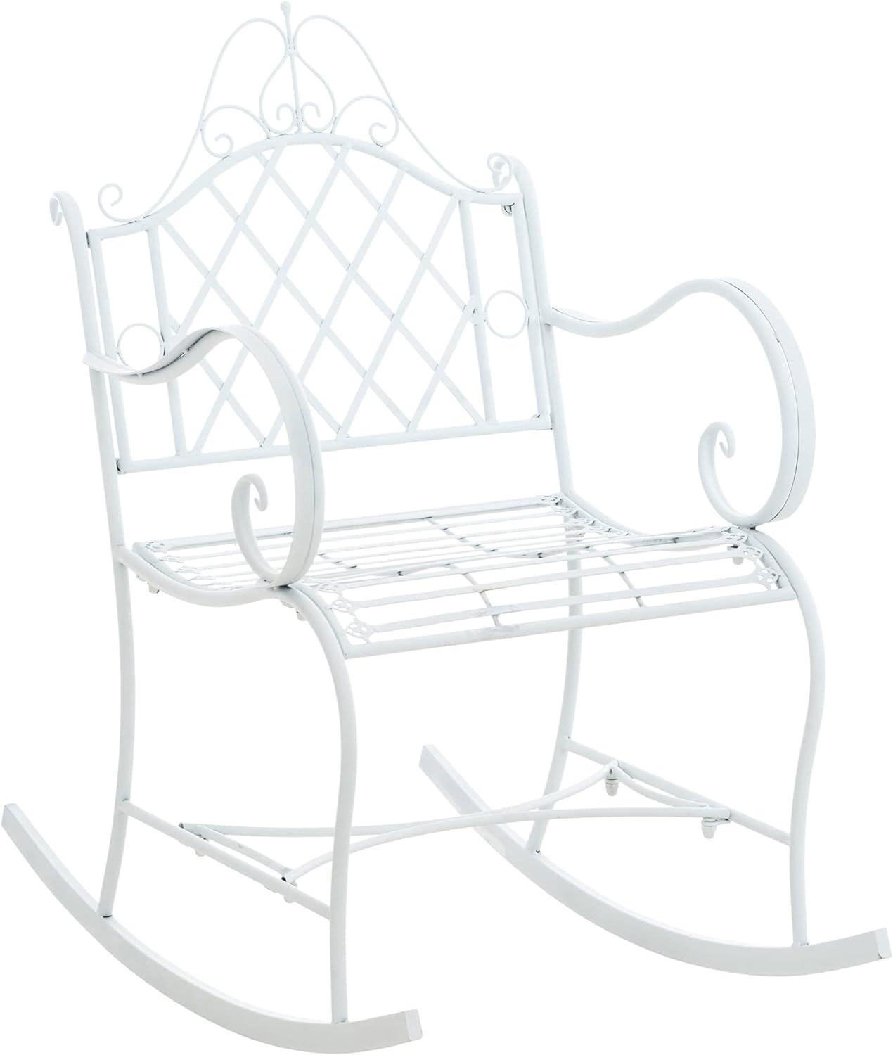 Der CLP Schaukelstuhl Ansan in Weiß vereint Komfort und Stil. Hergestellt aus robustem Metall, bietet er eine breite Sitzfläche und eine hohe Rückenlehne, die für entspannende Momente auf Balkon, Terrasse oder im Garten sorgen. Handgefertigte Details und eine antike Patina verleihen diesem Stuhl einen nostalgischen Charme. Mit einem Gewicht von 7 kg ist er stabil und langlebig. **Highlights** - Robuster Schaukelstuhl aus Metall - Breite Sitzfläche und hohe Rückenlehne für Komfort - Handgefertigte Details und antike Patina - Geeignet für Balkon, Terrasse und Garten - Stabil und robust mit einem Gewicht von 7 kg **Produkteigenschaften** - Farbe: Weiß - Material: Metall (Eisen) - Maße: H 97 cm, B 59 cm, T 90 cm, SH 47 cm, Sitzfläche 50 x 45 cm, Rückenlehne 54 cm, Armlehne 24 cm - Gewicht: 7 kg
