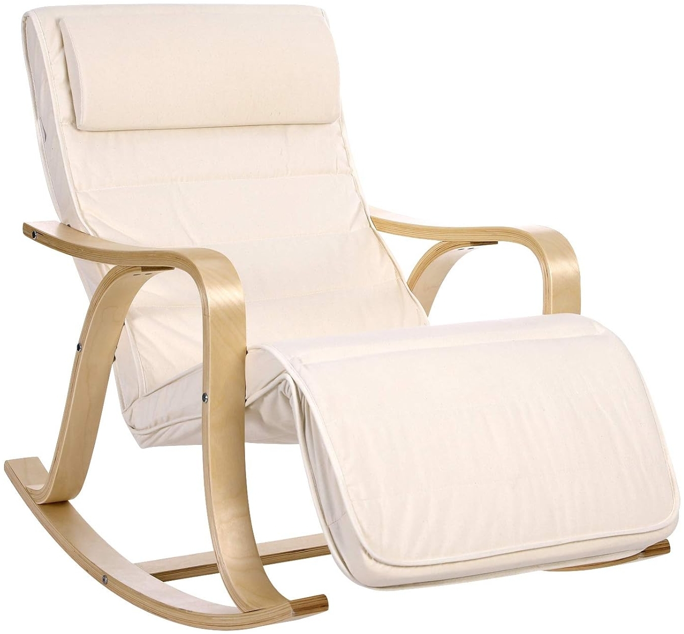 SchaukelstuhlSchwingsessel mit 5-Fach verstellbarer Fußstütze, Relaxstuhl, Belastbarkeit 150 kg, Gestell aus Birkenholz, Bezug aus Baumwolle, Beige LYY41M