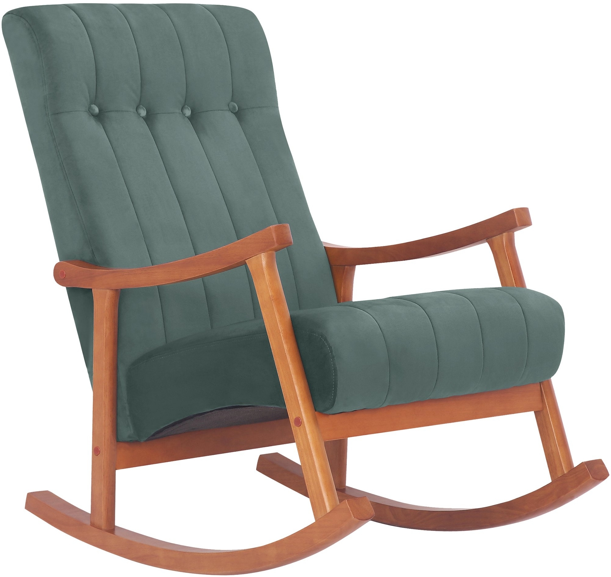 Der Schaukelstuhl Saltillo aus Samt bietet eine stilvolle und bequeme Sitzgelegenheit für den täglichen Gebrauch. Mit einer gut gepolsterten Sitzfläche und einer raffinierten Steppung sorgt er für hohen Komfort. Die großzügige Sitzfläche und die hohen Armlehnen ermöglichen auch längere Sitzphasen ohne Ermüdung. Das stabile Gestell aus Kautschukholz und die belastbaren Holzkufen garantieren eine lange Lebensdauer und ein gemütliches Flair in jedem Wohnambiente. **Highlights** - Bequeme Polsterung für hohen Sitzkomfort - Angenehme Sitzposition durch Rückenlehne - Stabile Konstruktion aus Kautschukholz - Strapazierfähiger Bezug aus 100% Polyester - Max. Belastbarkeit von 130 kg **Produkteigenschaften** - Gesamthöhe: 98 cm - Gesamtbreite: 62 cm - Gesamttiefe: 92 cm - Sitzhöhe: 47 cm - Sitzfläche: 55 x 57 cm - Höhe Rückenlehne: 71 cm - Gewicht: 15 kg - Pflegehinweise: Leichte Verschmutzung mit feuchtem Baumwolltuch abwischen, Oberflächen nur mit geeignetem Aufsatz absaugen, keine Haushaltsreiniger verwenden
