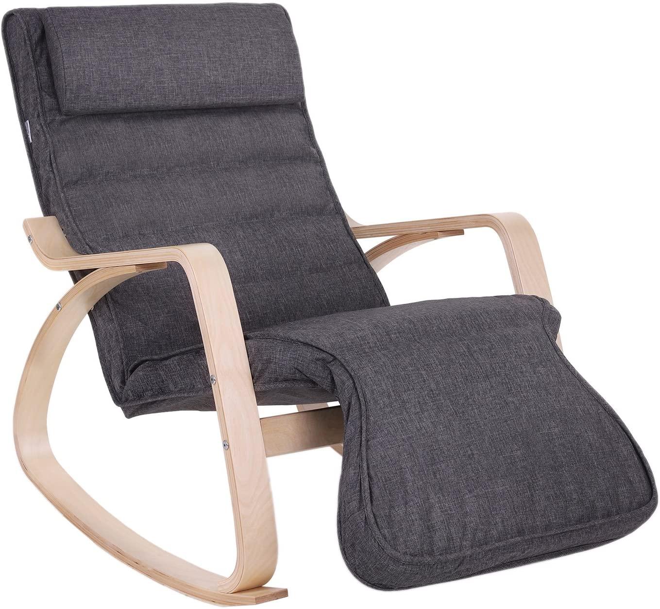 - NACH INNEN GEFORMTE, VERSTELLBARE FUßSTÜTZE, LEICHT AUFSTEHEN: Das Fußteil ist nicht nur nach Belieben 5-fach verstellbar, sondern auch praktisch nach innen geformt, entspannt den Körper und ermöglicht leicht zu wippen und auf zu stehen - GUTE TRAGKRAFT UND ROBUSTHEIT: Der Eisenrahmen des Sessels und das Birkengestell gewährleisten max. Belastbarkeit bis 150 kg. Das Anti-Rutsch Filzband, das unter den Füßen angebracht ist, schützt den Boden vor Kratzen, und macht den Stuhl leise beim Schaukeln - KISSEN UND BEZUG ABNEHMBAR: Der Bezug vom Relaxstuhl aus Leinenimitat vereint schönes Hautgefühl und Atmungsaktivität in sich; durch den Reißverschluss am Rücken und Klettverschluss am Kissen ist er leicht zum Waschen abtrennbar - HOHER SITZKOMFORT: Gepolsterter Bezug und Kissen hat hohen Sitzkomfort und gute Elastizität, und entspannt Körper und Geist in der Freizeit, darauf kann man auch Babys zum Schlafen bringen - EINFACHE MONTAGE: Dank der beigefügten verständlichen Aufbauanleitung ist der Schwingsessel leicht und schnell auf- und abzubauen !\[LYY42GYZ\]( | Das Fußteil lässt sich einfach auf 5 verschiedene Positionen einstellen. | Die Kopfstütze lässt sich in der Höhe individuell verstellen. Zudem ist der Bezug des Kopfkissens abnehm- und waschbar. | Die Füße des Schaukelstuhls sind mit Filz versehen, was Ihren Boden vor Kratzern schützt. | **Produktdetails:** - Farbe: Dunkelgrau - Material: Birkenholz, Schaumstoff, Eisen, Leinenimitat - Größe: 67 x 115 x 91 cm (L x B x H) - Gewicht: 9,8 kg - Max. statische Belastbarkeit: 150 kg **Lieferumfang:** - 1 x Schaukelstuhl - 1 x Anleitung (DE, EN, FR, IT, ES)