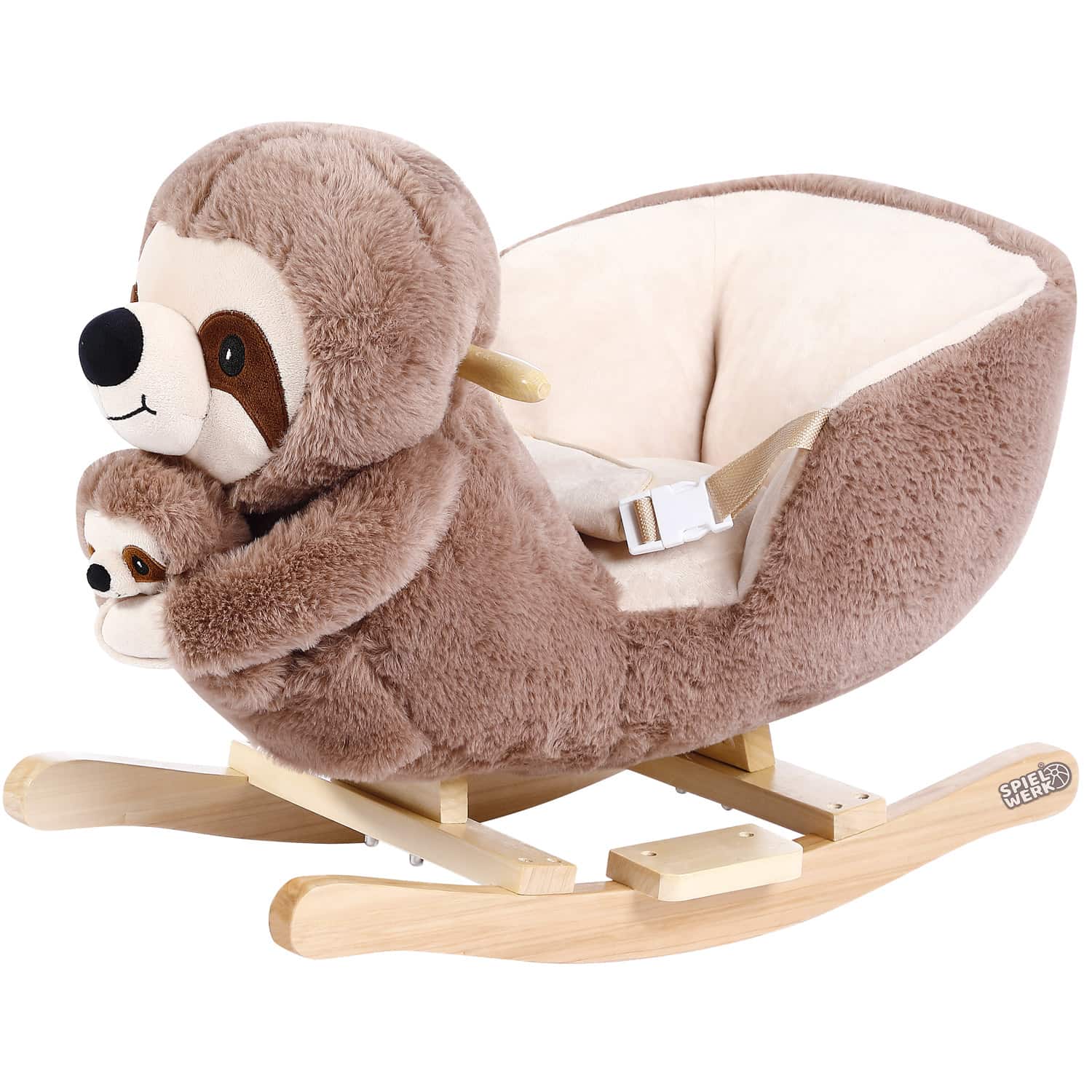 Das Schaukelfaultier ist aus extra weichem Plüsch und lädt Kleinkinder sowie Babys mit seinem freundlichen Gesichtsausdruck zum Schaukeln ein. Das kleine Baby-Faultier kann zum Spielen separat entnommen werden, als Kuscheltier. Durch die bequeme und sichere Sitzschale mit Rückenlehne und einem Anschnallgurt, bleibt ihr Kind auch bei turbulenteren Schaukelabenteuern fest im Sattel. Das Faultier hat ein integriertes Soundmodul; so macht das Schaukeln noch mehr Freude. Das Holzgestell und die Griffe sorgen für erhöhte Stabilität und sind bis zu 45 kg belastbar. Die Schaukeltiere trainieren Muskulatur und Balance auf kindgerechte Weise. Eine große Portion Spaß und Selbstbewusstsein gibt es dazu! **Produktvorteile:** - stabiles Holzgestell - 2 Holzgriffe zum Festhalten - abgerundete Kanten - extra weiches Plüsch zum Ankuscheln - Baby Faultier kann zum Spielen separat entnommen werden - Schaukelwinkel max. 30°, dadurch kann auch bei wildem Schaukeln nichts passieren - ideal zum Trainieren der Balance - Achtung: nur für den Hausgebrauch. - Achtung: Benutzung unter unmittelbarer Aufsicht von Erwachsenen. **Technische Daten:** - Altersempfehlung: für Kinder ab 12 Monaten geeignet - Gesamtmaß (LxBxH): 58 x 35 x 53 cm - Sitzhöhe: 22 cm - Material Bezugsstoff: 100% Polyester - Material Füllung: 750 g/m² Baumwolle - Material Gestell: Holz - max. Tragkraft: 45 kg - Batterien: LR44 (im Lieferumfang enthalten) **Lieferumfang:** - 1 x Schaukeltier - 1 x Faultierbaby - Montagematerial - Aufbauanleitung - Batterien